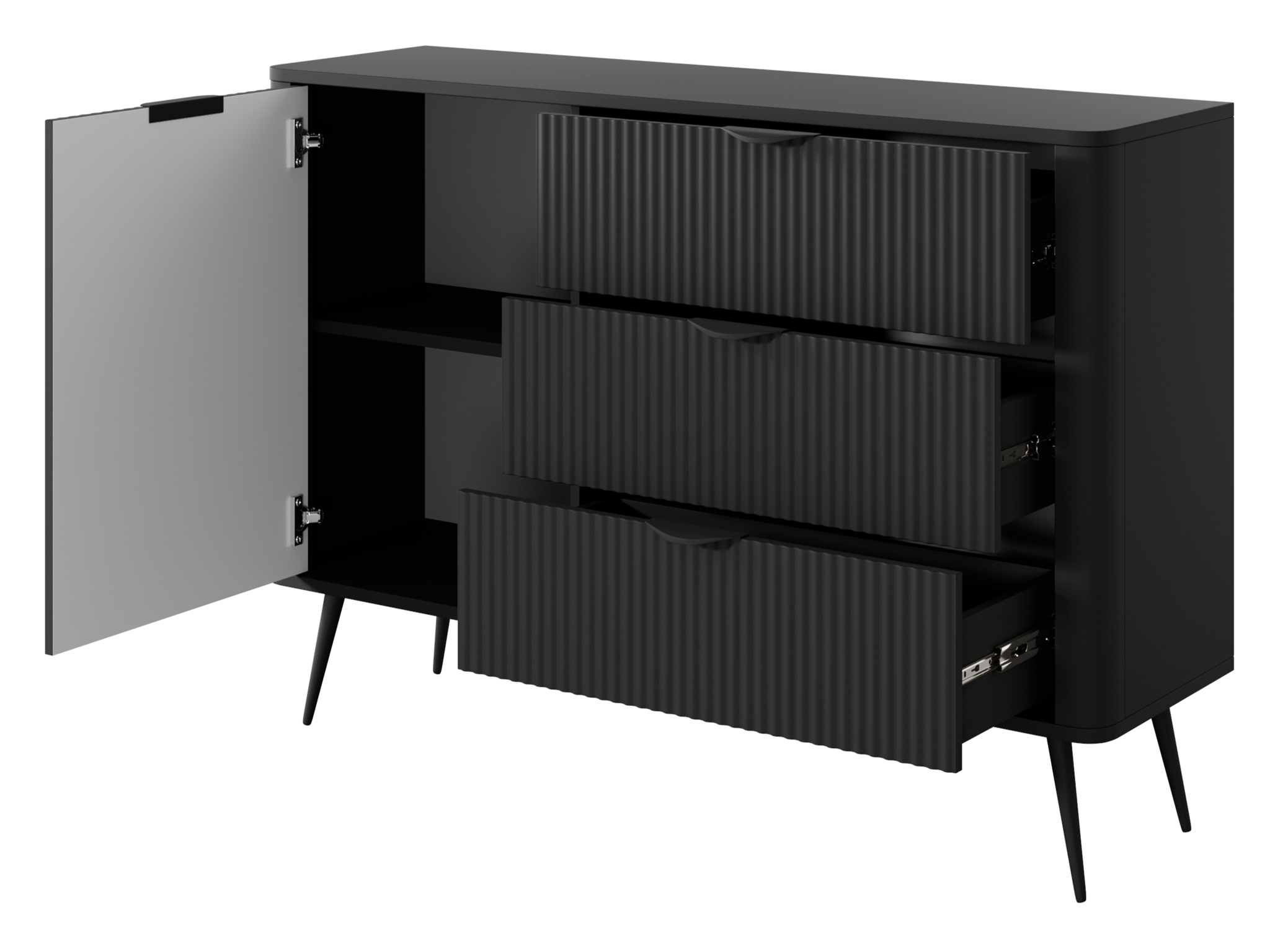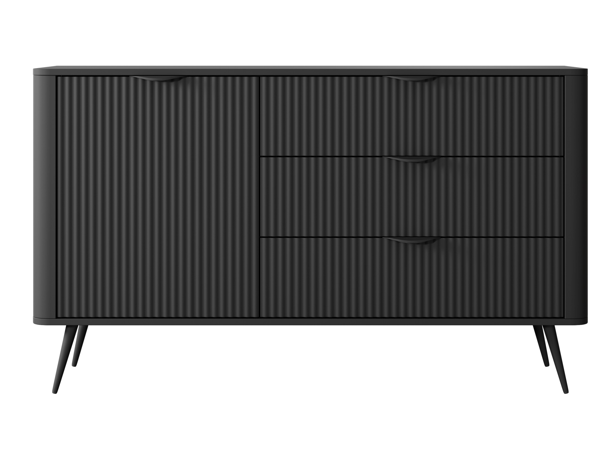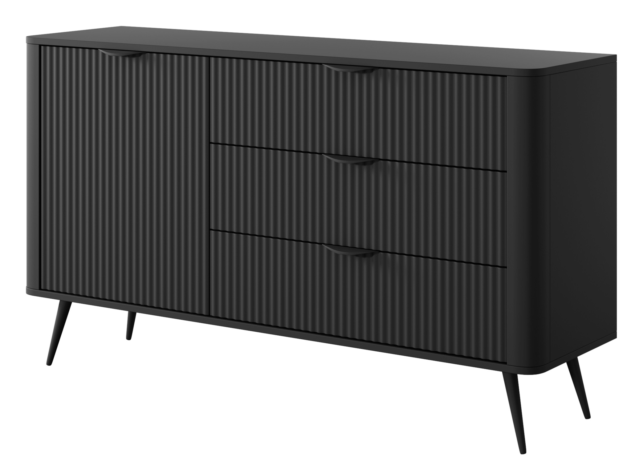 Meble Lanett utrzymane są w matowej, głębokiej czerni, która doskonale koresponduje zarówno z jasnymi, jak i ciemnymi aranżacjami wnętrz. Czarny kolor wprowadza w pomieszczeniu klasę i ponadczasowy charakter, a jednocześnie stanowi idealne tło dla dodatków w kolorze złota, drewna czy miedzi.