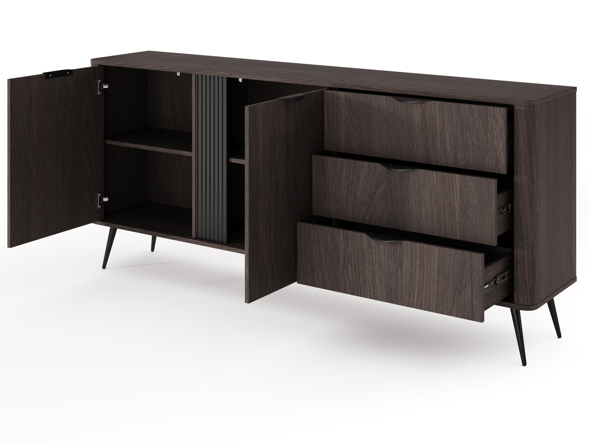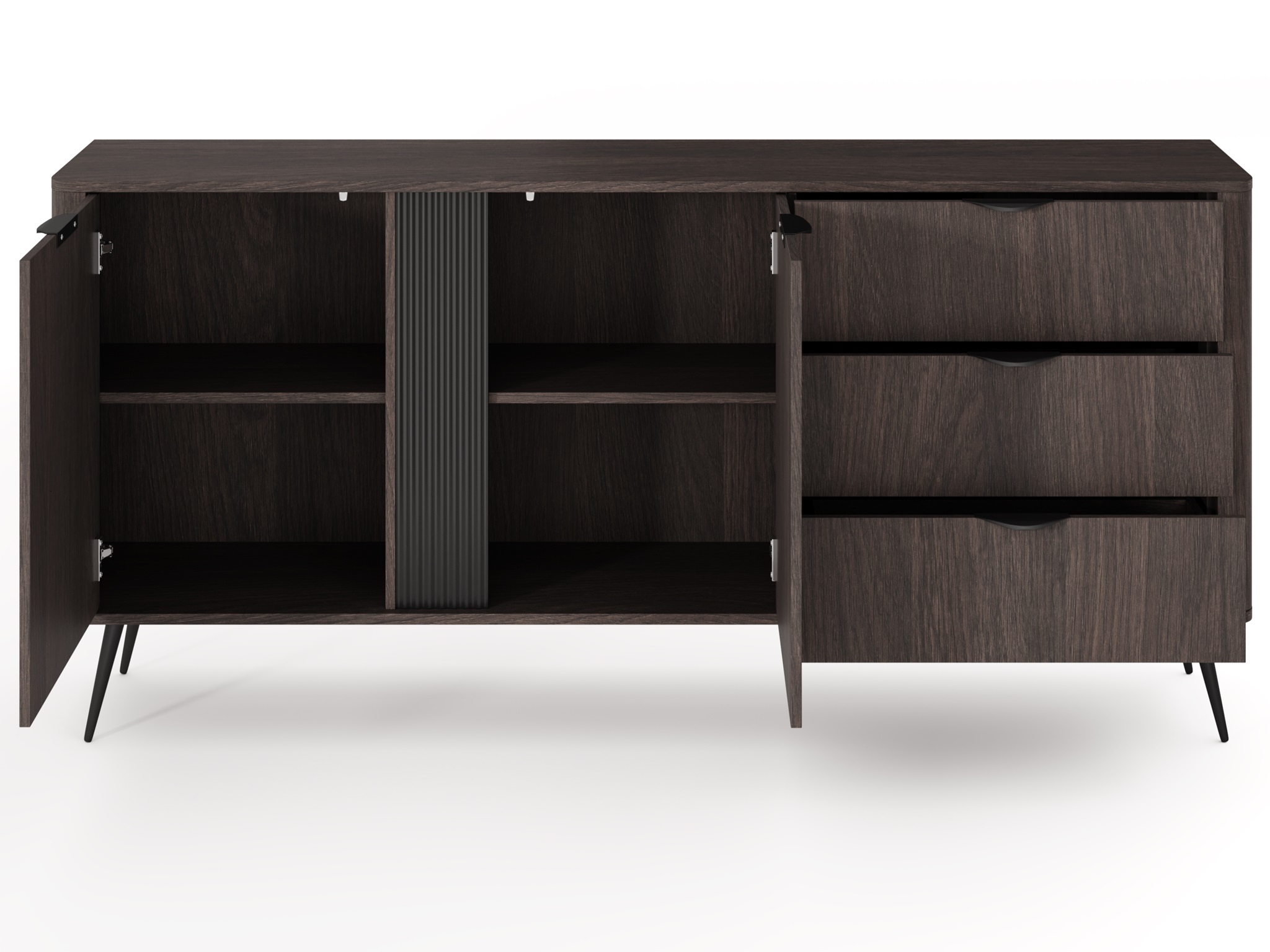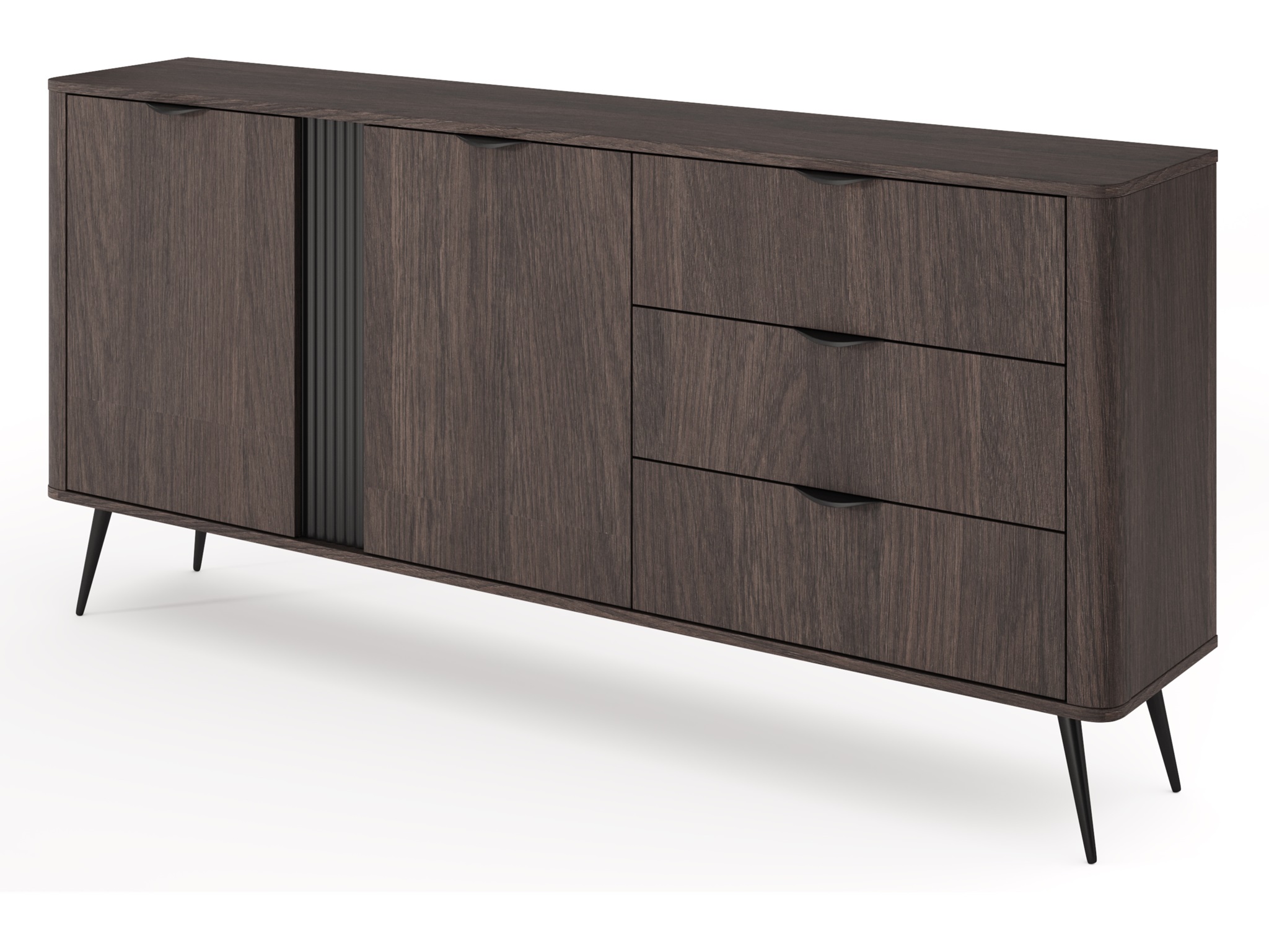 Kolekcja VIRGO to eleganckie i funkcjonalne meble, które łączą modny dekor dąb Dunin z czarnymi dodatkami. Charakterystyczne ryflowane listwy, zaokrąglone krawędzie oraz metalowe nóżki i uchwyty sprawiają, że meble z tej kolekcji idealnie wpisują się w nowoczesne wnętrza, dodając im stylu i lekkości.