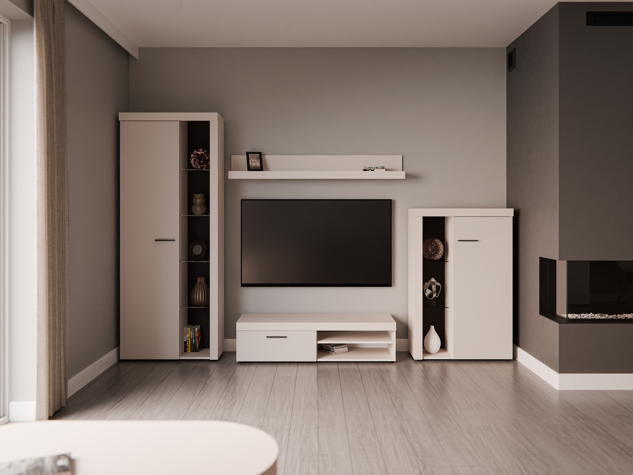 Przemyślany układ brył zapewnia wygodne miejsce na telewizor, sprzęt RTV, książki, dekoracje oraz przedmioty codziennego użytku. Mebel pozwala zachować porządek, jednocześnie podkreślając elegancki charakter strefy wypoczynkowej.
