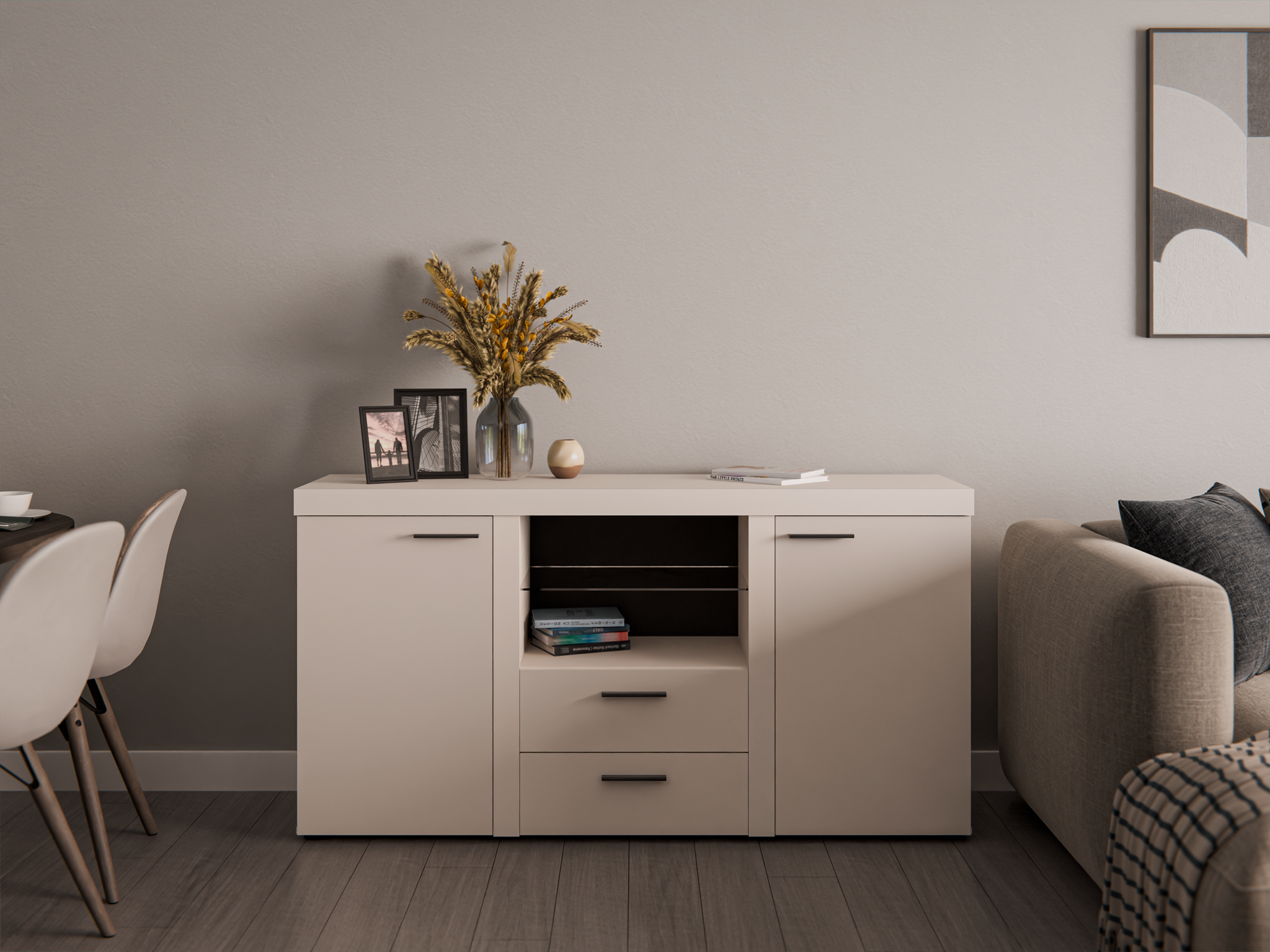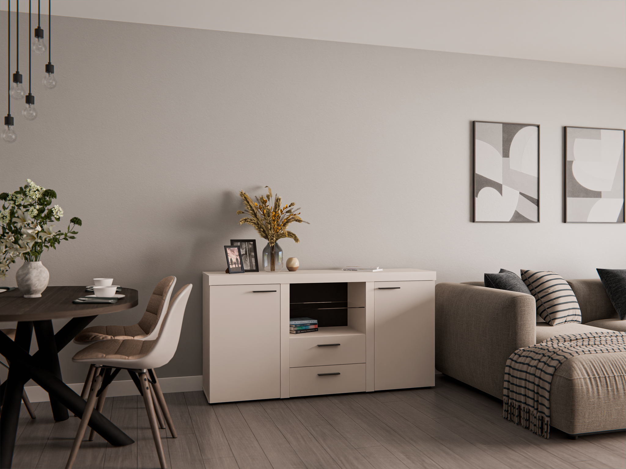 Jasny, neutralny odcień beżu piaskowego wprowadza do wnętrza poczucie harmonii i ciepła, optycznie powiększając przestrzeń. Dzięki temu komoda doskonale sprawdzi się zarówno w mniejszych mieszkaniach, jak i w przestronnych salonach. Jej uniwersalna kolorystyka stanowi idealne tło dla dodatków dekoracyjnych, roślin oraz oświetlenia.