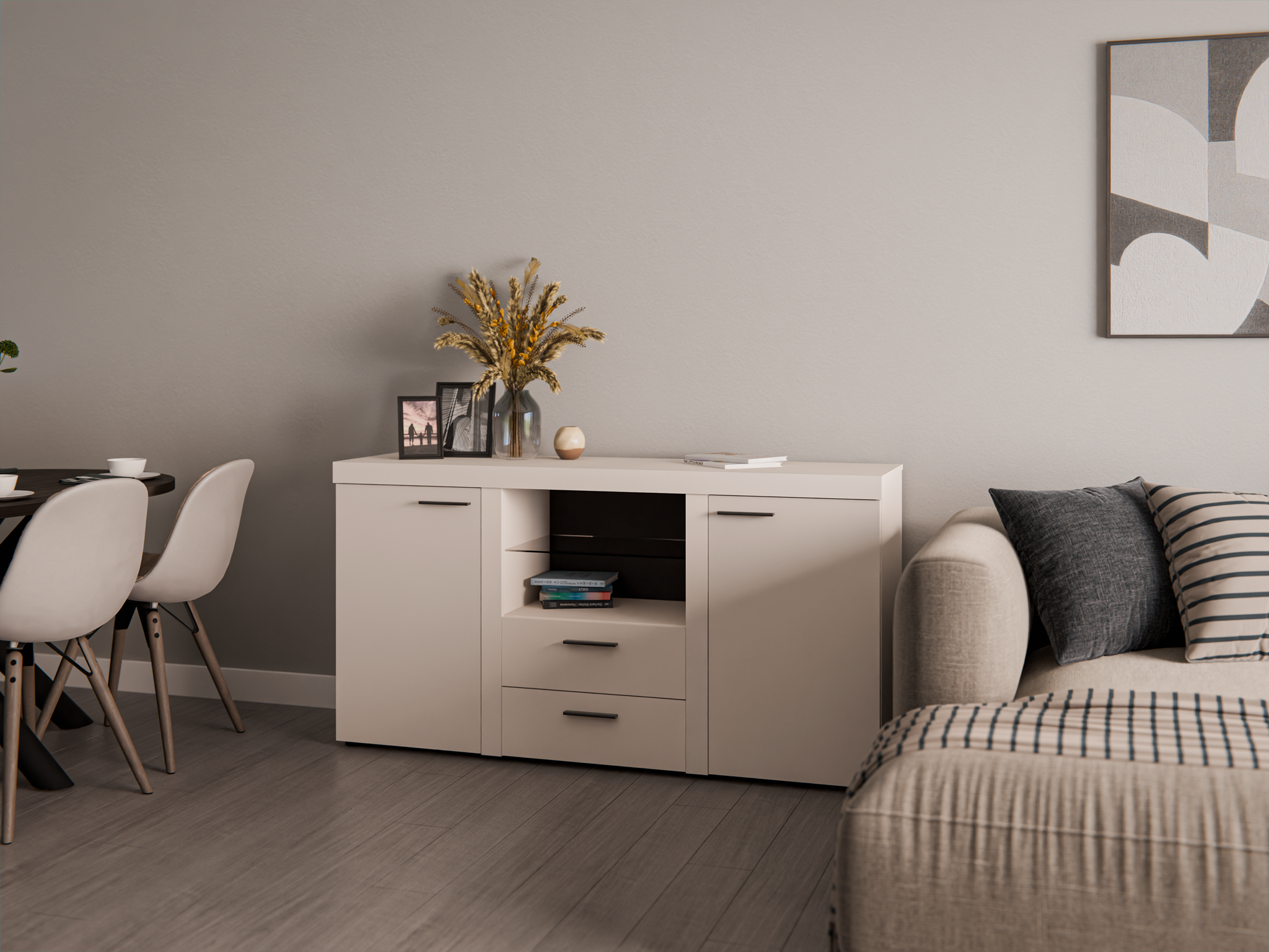 Komoda RAMON w kolorze beż piaskowy to propozycja dla osób poszukujących stylowych, a jednocześnie praktycznych mebli do salonu. Projekt łączy nowoczesne wzornictwo z wysoką jakością wykonania, charakterystyczną dla polskiej produkcji meblarskiej.