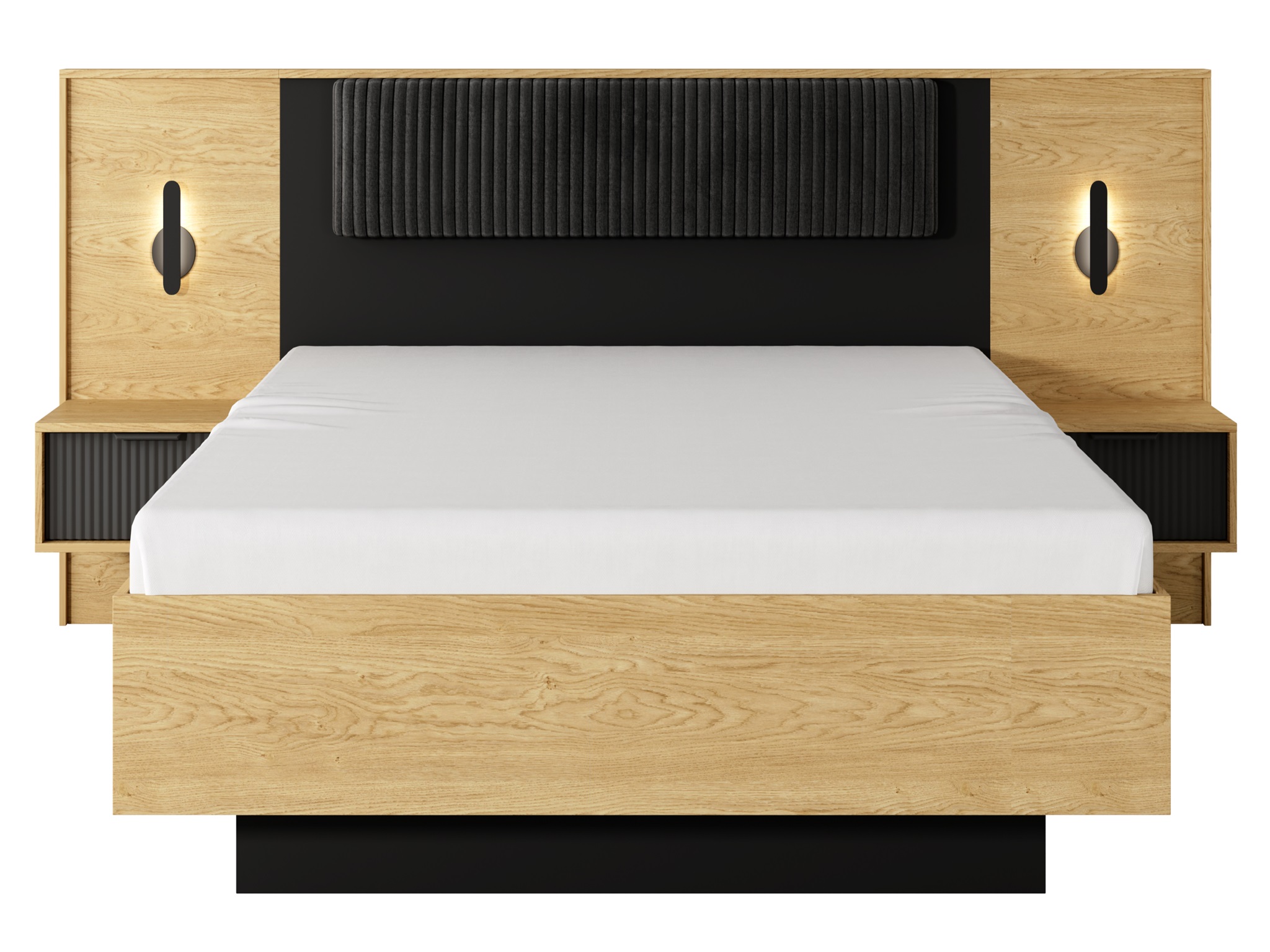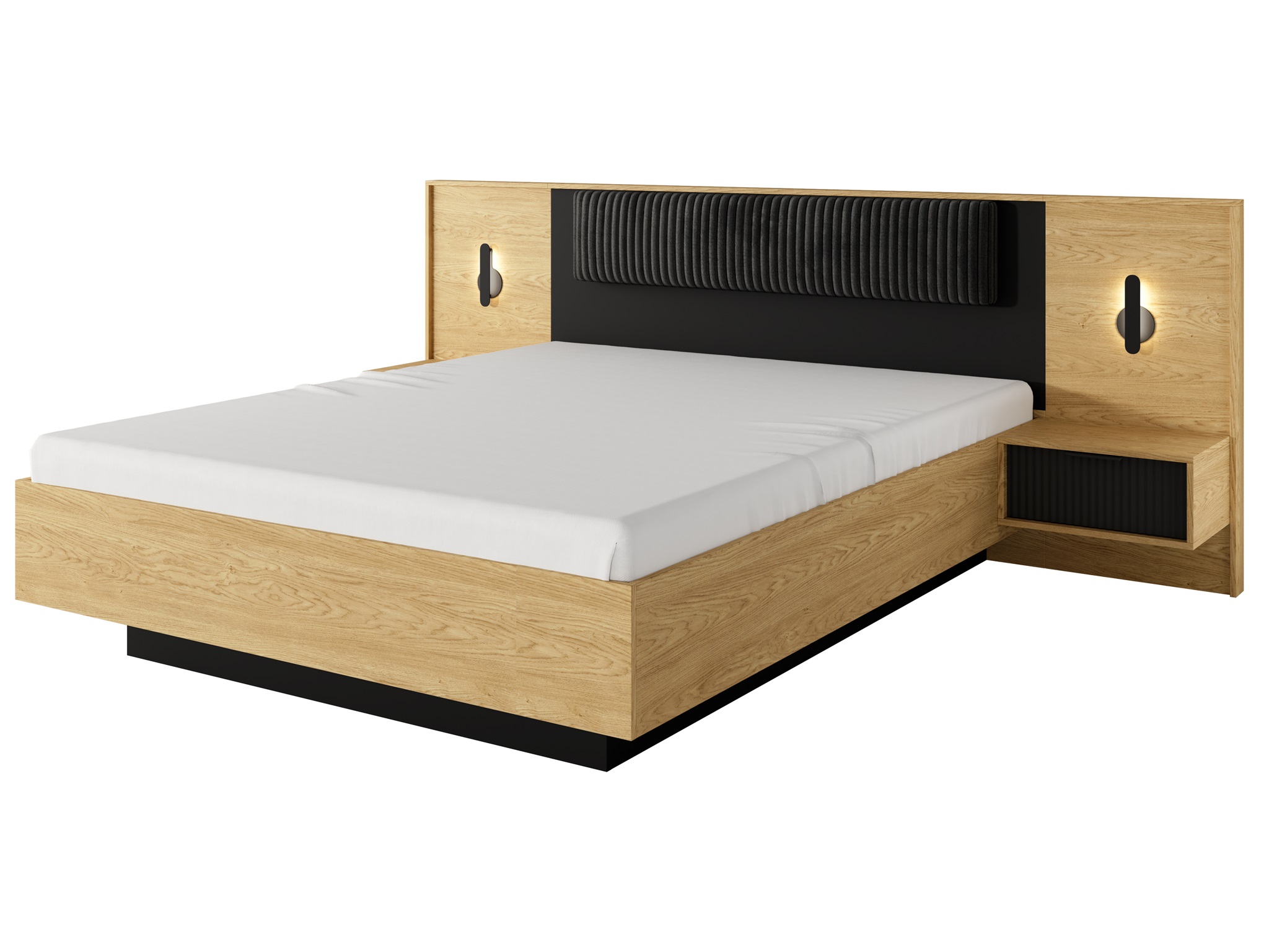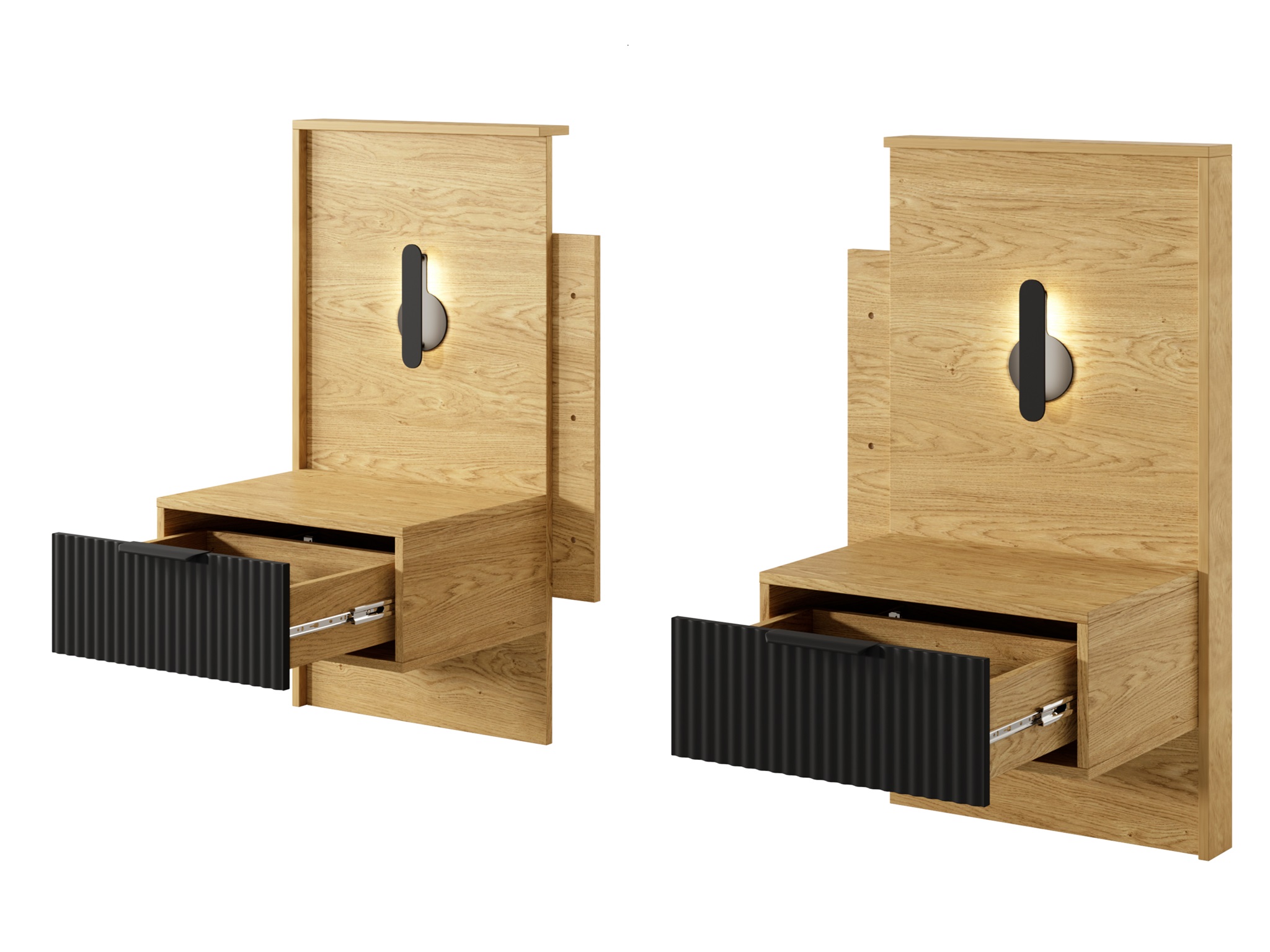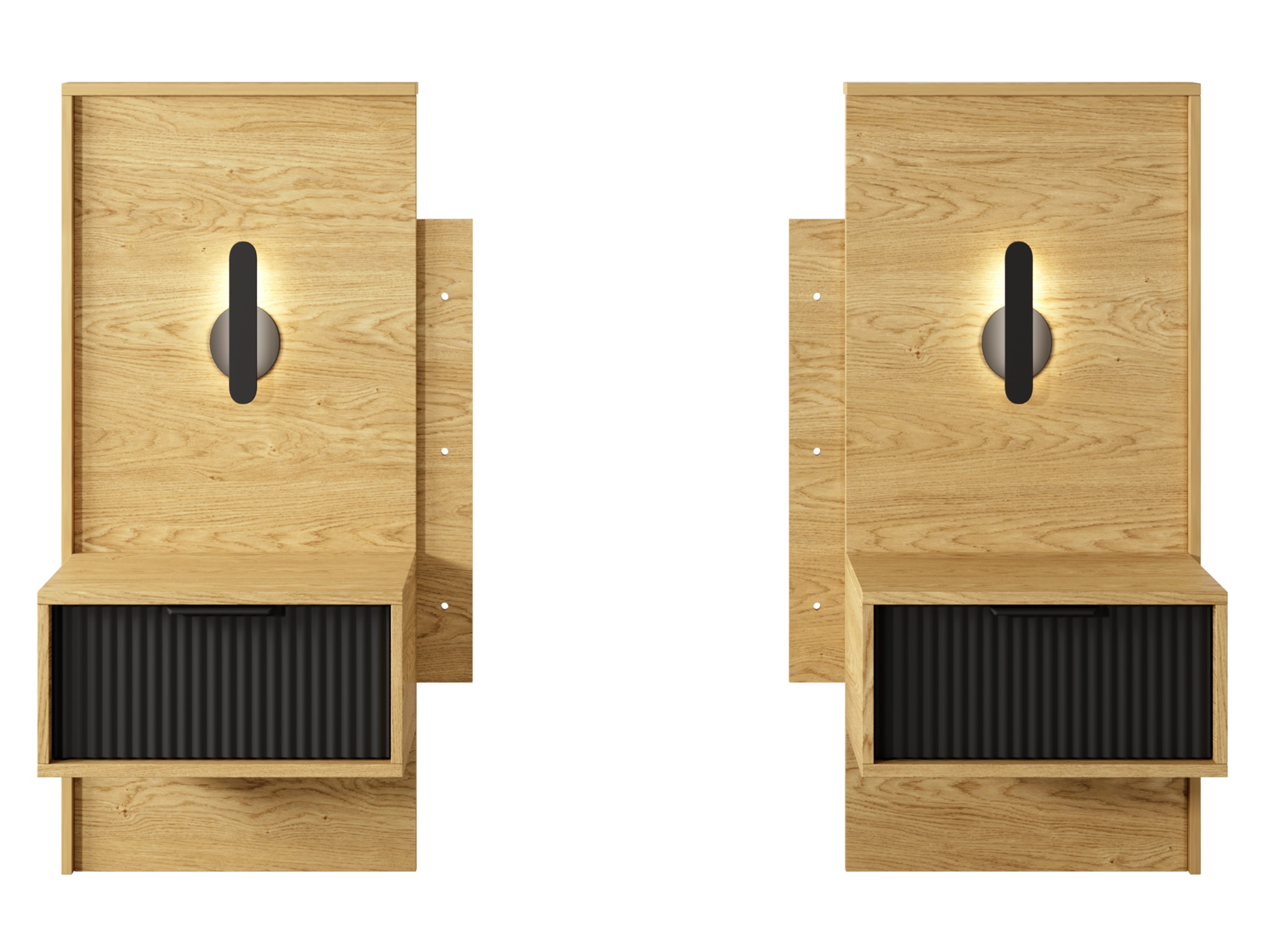 Kolekcja wyróżnia się harmonijnym połączeniem ciepłego odcienia drewna w kolorze dębu baltic z głęboką, matową czernią. Ta modna i elegancka kolorystyka stanowi doskonałą bazę dla nowoczesnych aranżacji, wprowadzając do pomieszczenia atmosferę luksusu i przytulności. Unikalnym elementem dekoracyjnym są ryflowane fronty szuflad wykonane z płyty MDF, które nadają meblom trójwymiarowej głębi i podkreślają ich unikalny charakter.