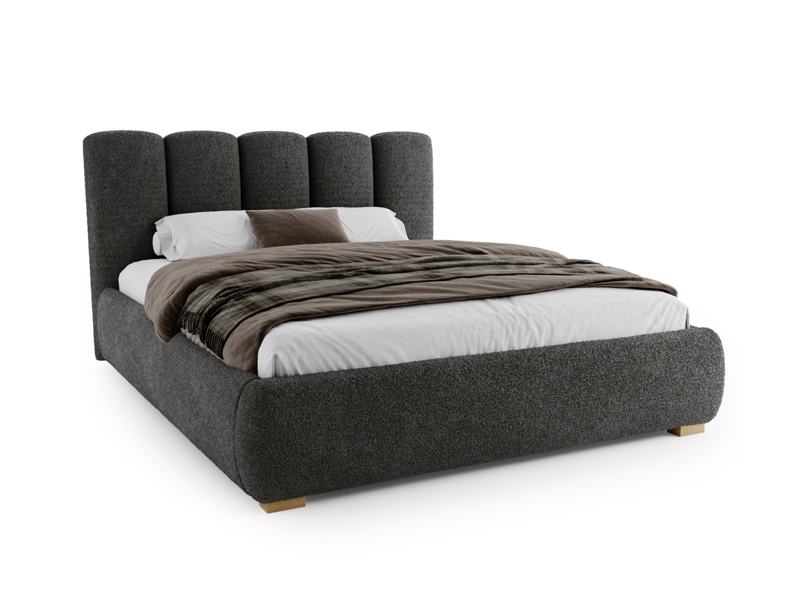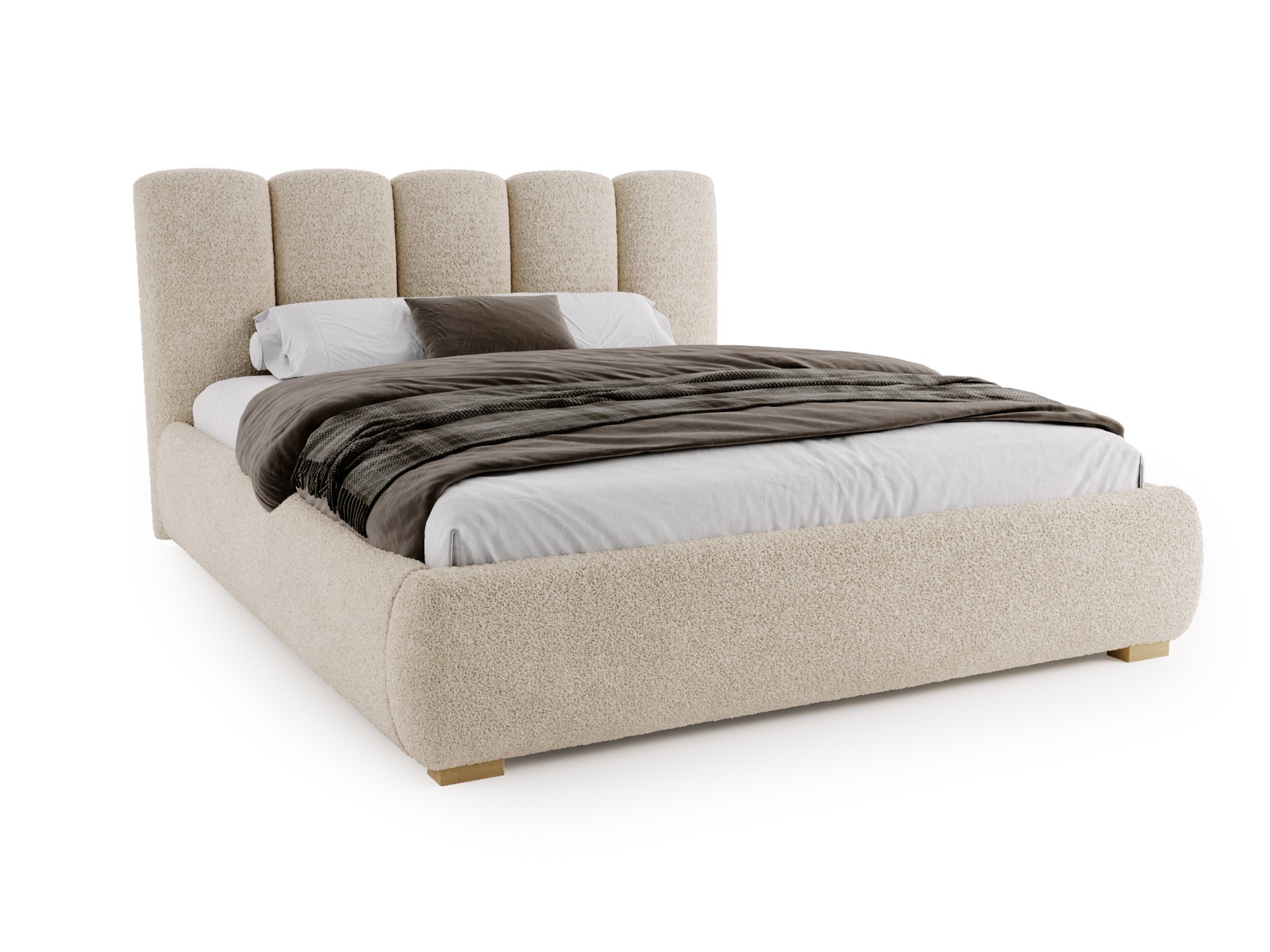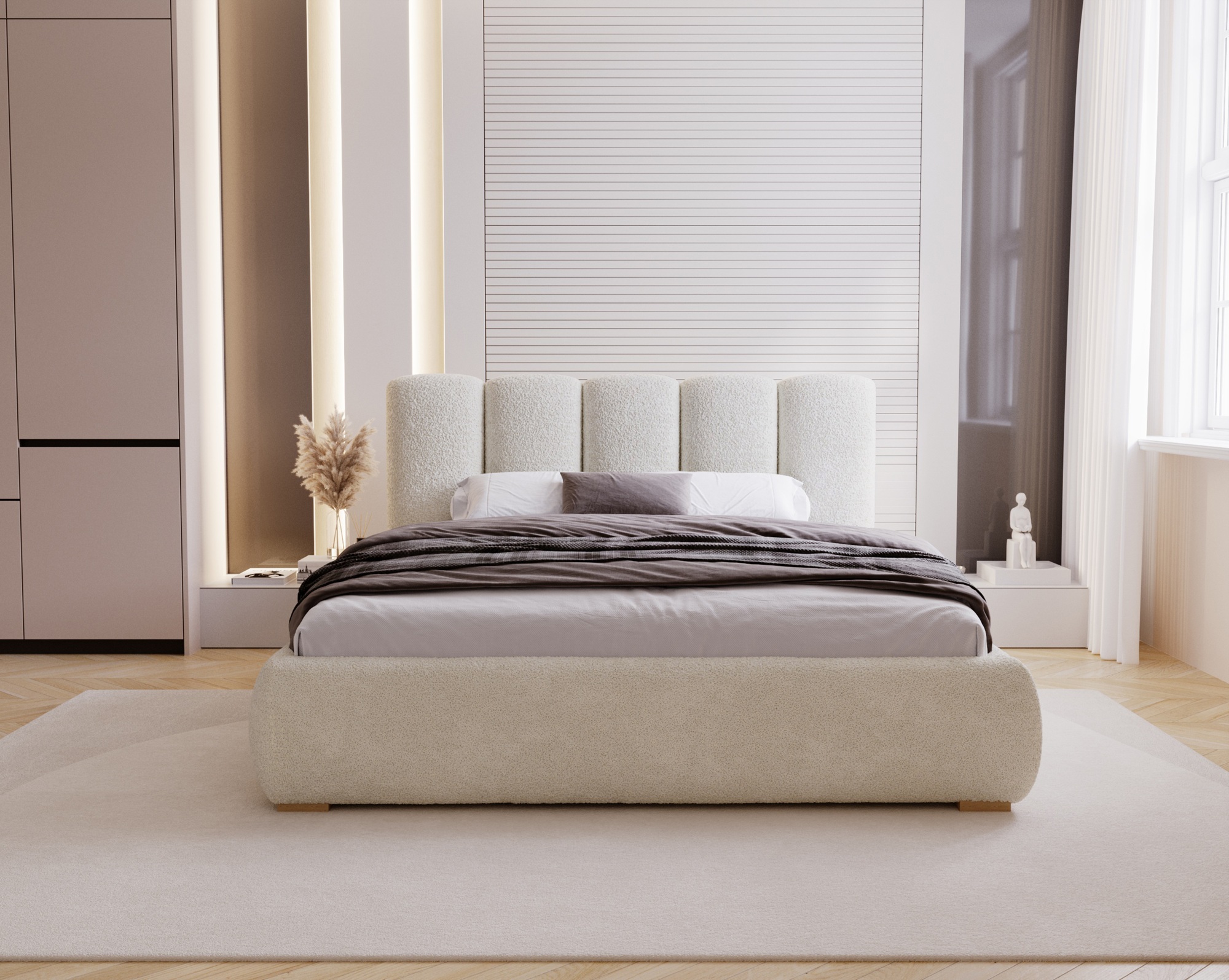 Jego miękka, zaokrąglona bryła oraz elegancki zagłówek z pionowymi przeszyciami tworzą harmonijną, przytulną przestrzeń sprzyjającą relaksowi. Inspiracja stylem soft minimalism i japandi sprawia, że łóżko doskonale wpisuje się w aktualne trendy wnętrzarskie.