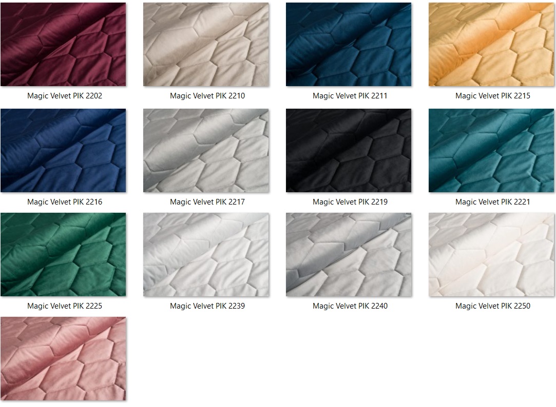 Magic Velvet Pik to wysokiej jakości tkanina welwetowa o wyjątkowo miękkiej, przyjemnej w dotyku powierzchni i subtelnym połysku. Jej charakterystyczną cechą jest geometryczne, trójwymiarowe pikowanie, które nadaje materiałowi elegancki i dekoracyjny wygląd.