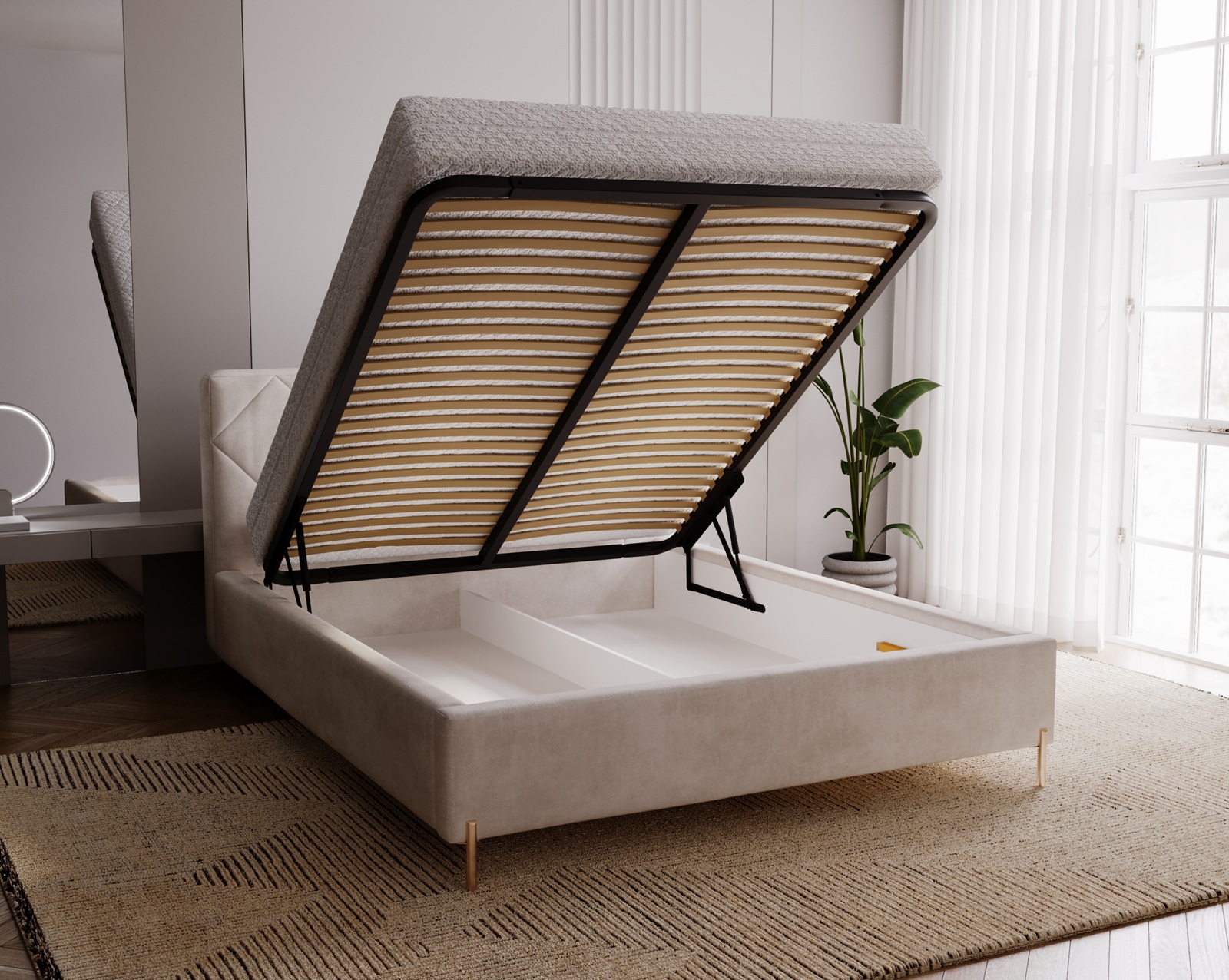Solidna konstrukcja oparta na połączeniu wytrzymałej płyty meblowej oraz drewna sosnowego zapewnia stabilność i długowieczność użytkowania, a zastosowanie wysokiej jakości pianki T28/T30 gwarantuje odpowiednie podparcie i komfort. Łóżko wyposażone jest w metalowy stelaż z podnośnikami gazowymi, dzięki którym dostęp do przestronnego pojemnika na pościel jest niezwykle łatwy i wygodny. To praktyczne rozwiązanie pozwala na przechowywanie pościeli, koców czy poduszek, pomagając utrzymać porządek w sypialni. Dno pojemnika wykonane z płyty HDF dodatkowo zwiększa jego trwałość. W zależności od preferencji użytkownika dostępne są wersje z 34 lub 48 listwami sprężynującymi, które poprawiają elastyczność podparcia materaca i wpływają na komfort snu.