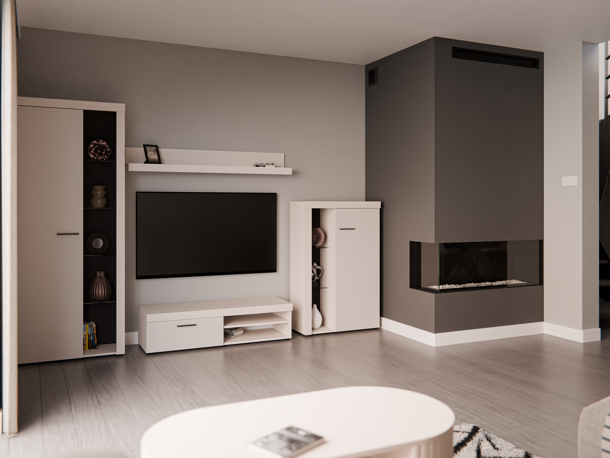 Przemyślany układ brył zapewnia wygodne miejsce na telewizor, sprzęt RTV, książki, dekoracje oraz przedmioty codziennego użytku. Meblościanka pozwala zachować porządek, jednocześnie podkreślając elegancki charakter strefy wypoczynkowej.