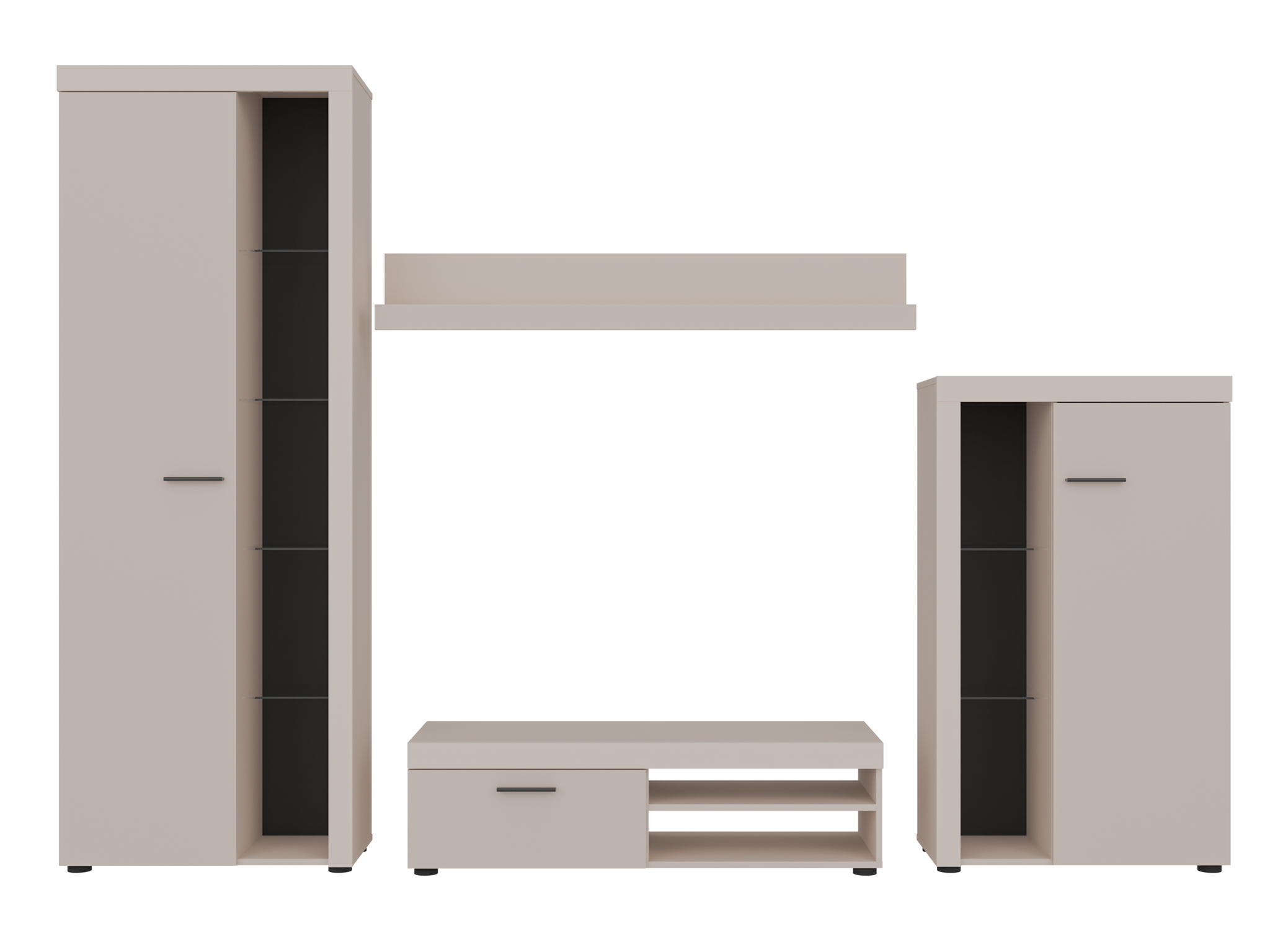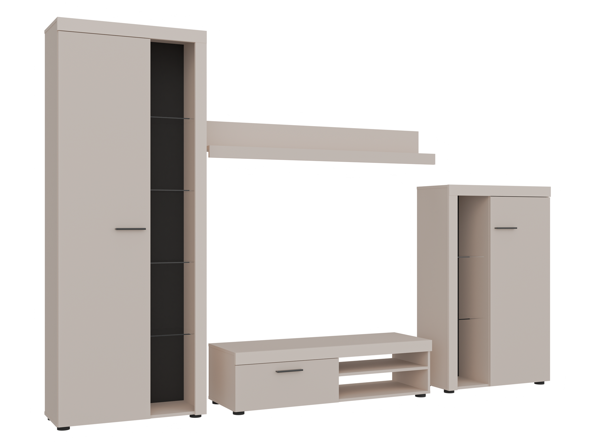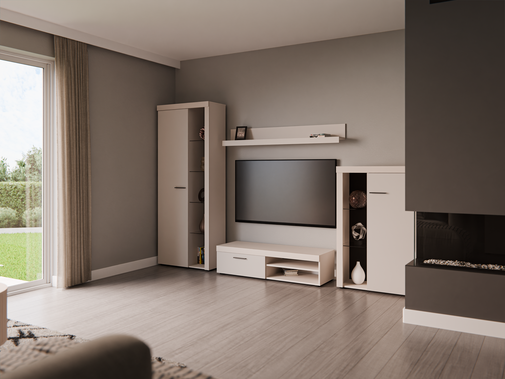 Jasny, neutralny odcień beżu piaskowego wprowadza do wnętrza poczucie harmonii i ciepła, optycznie powiększając przestrzeń. Dzięki temu meblościanka doskonale sprawdzi się zarówno w mniejszych mieszkaniach, jak i w przestronnych salonach. Jej uniwersalna kolorystyka stanowi idealne tło dla dodatków dekoracyjnych, roślin oraz oświetlenia.