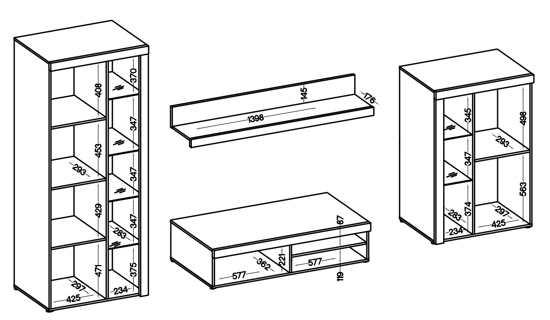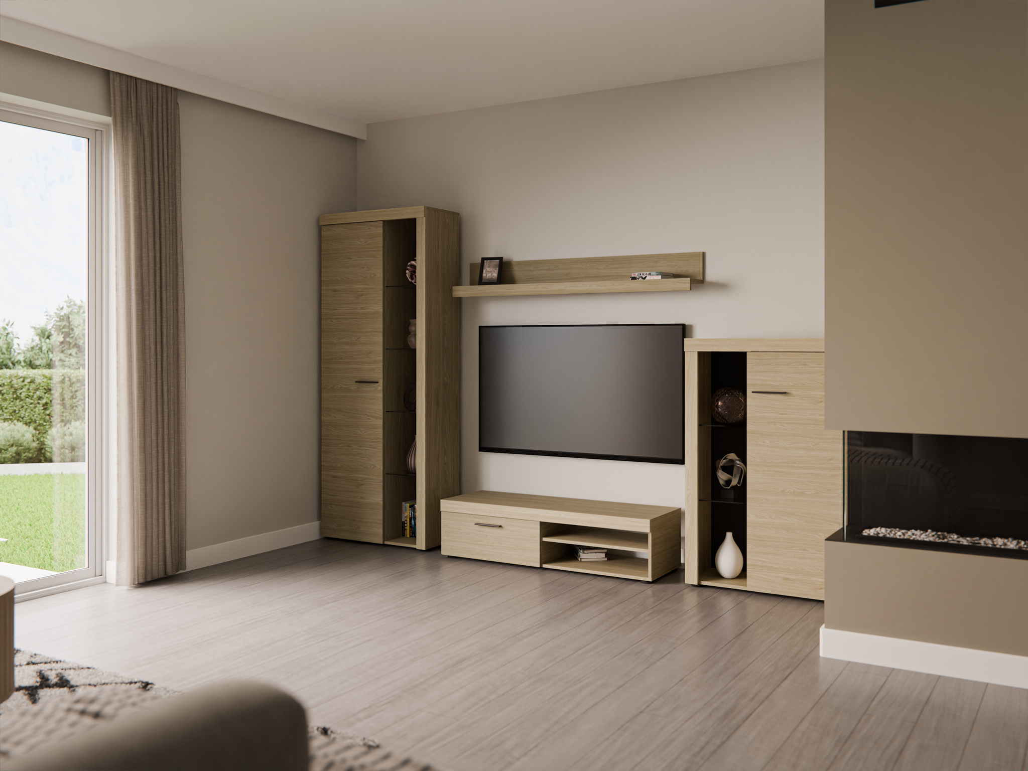 Przemyślany układ brył zapewnia wygodne miejsce na telewizor, sprzęt RTV, książki, dekoracje oraz przedmioty codziennego użytku. Meblościanka pozwala zachować porządek, jednocześnie podkreślając elegancki charakter strefy wypoczynkowej.
