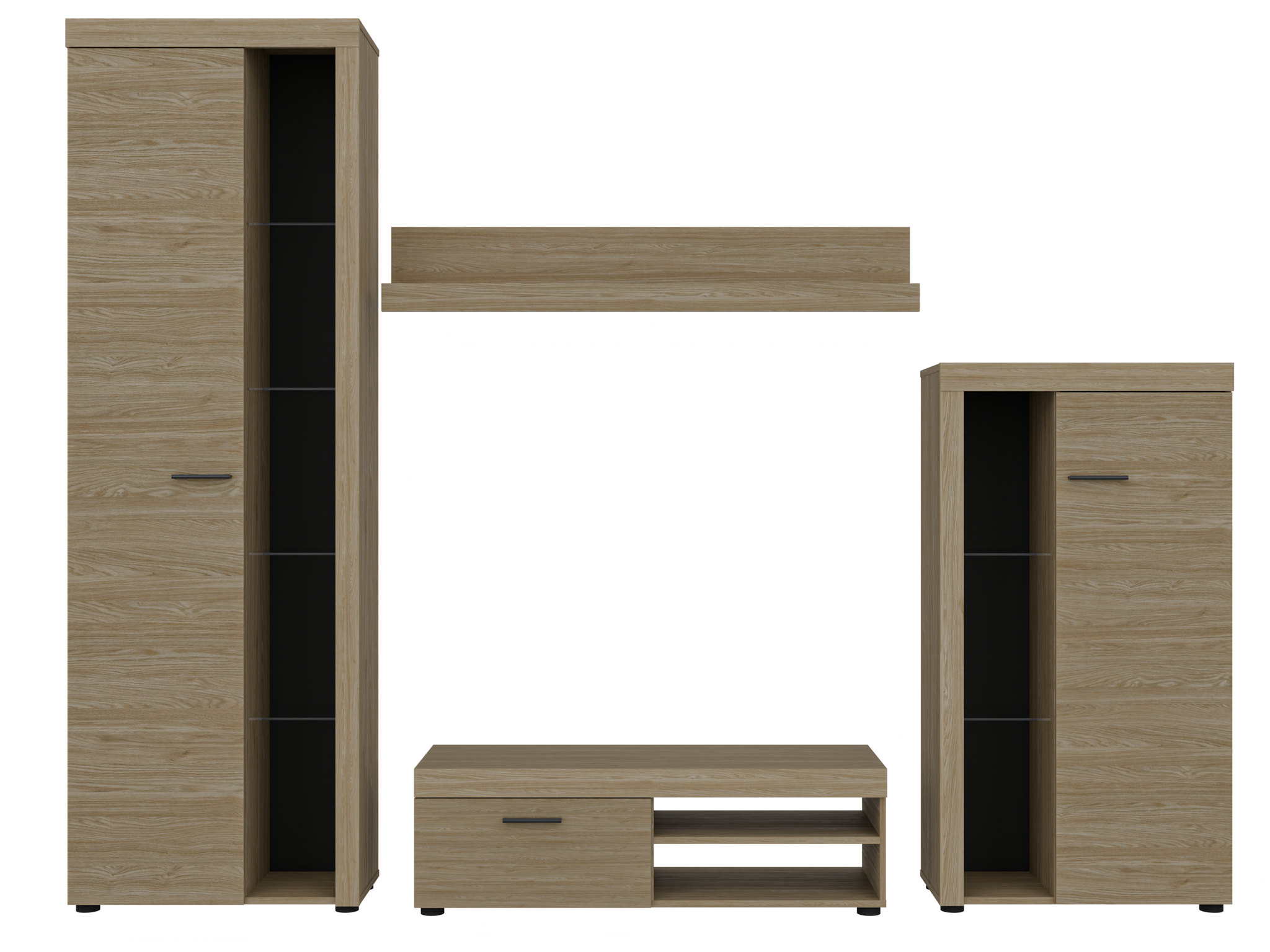 Jasny, neutralny odcień dębu wprowadza do wnętrza poczucie harmonii i ciepła. Dzięki temu meblościanka doskonale sprawdzi się zarówno w mniejszych mieszkaniach, jak i w przestronnych salonach. Jej uniwersalna kolorystyka stanowi idealne tło dla dodatków dekoracyjnych, roślin oraz oświetlenia.