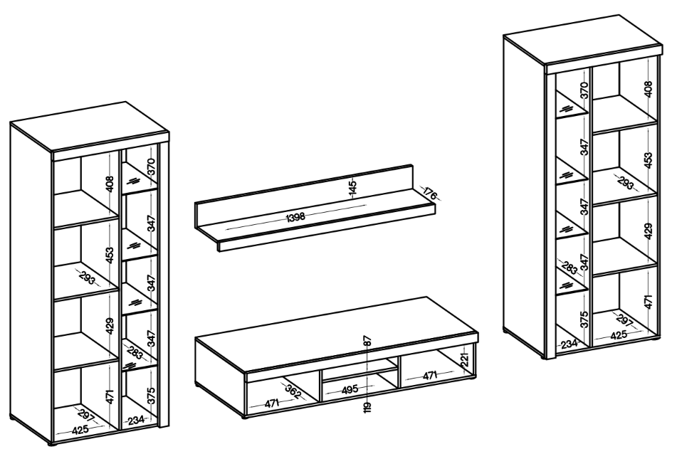 Przemyślany układ brył zapewnia wygodne miejsce na telewizor, sprzęt RTV, książki, dekoracje oraz przedmioty codziennego użytku. Meblościanka pozwala zachować porządek, jednocześnie podkreślając elegancki charakter strefy wypoczynkowej.