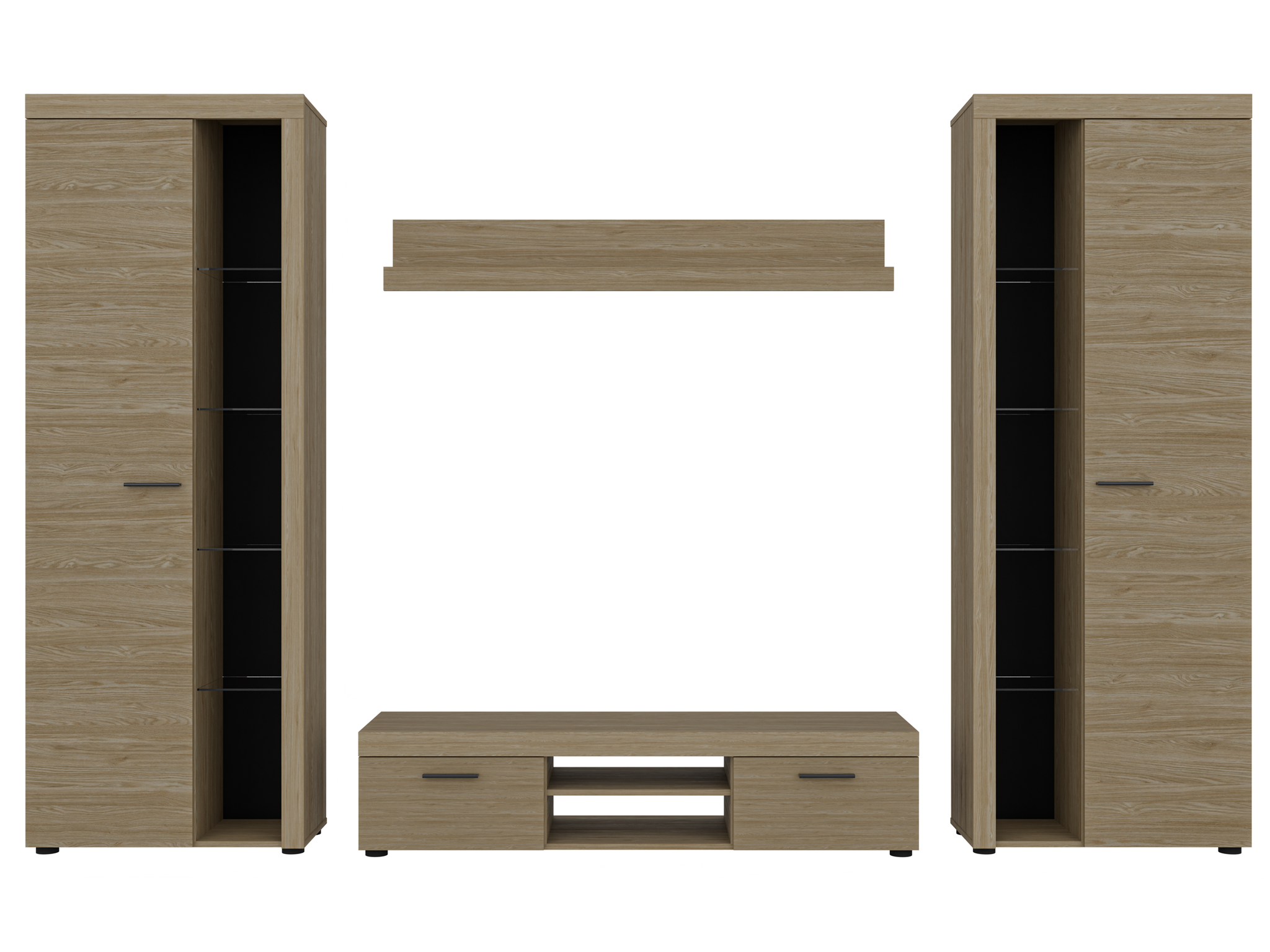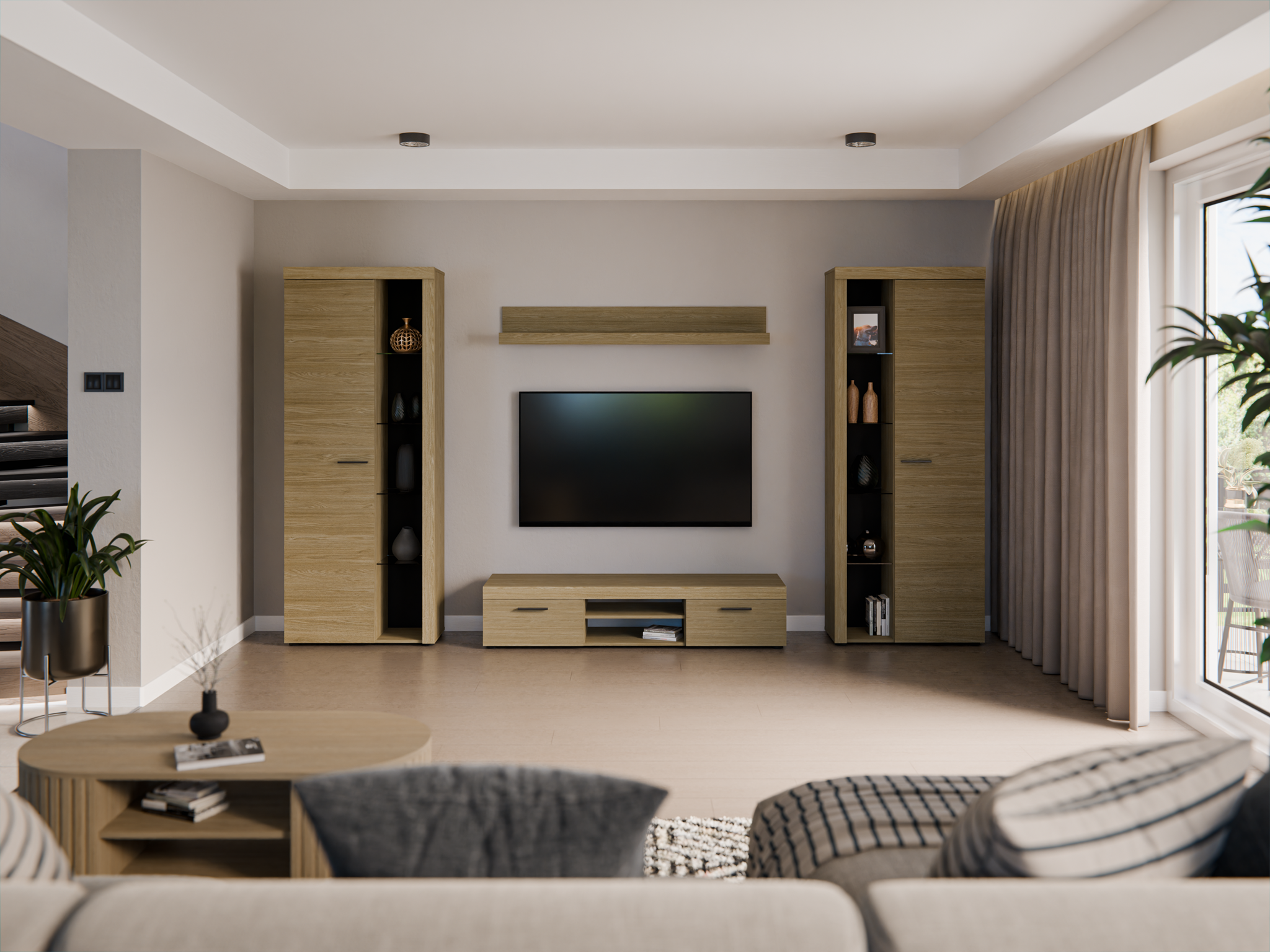 Jasny, neutralny odcień dębu wprowadza do wnętrza poczucie harmonii i ciepła. Dzięki temu meblościanka doskonale sprawdzi się zarówno w mniejszych mieszkaniach, jak i w przestronnych salonach. Jej uniwersalna kolorystyka stanowi idealne tło dla dodatków dekoracyjnych, roślin oraz oświetlenia.