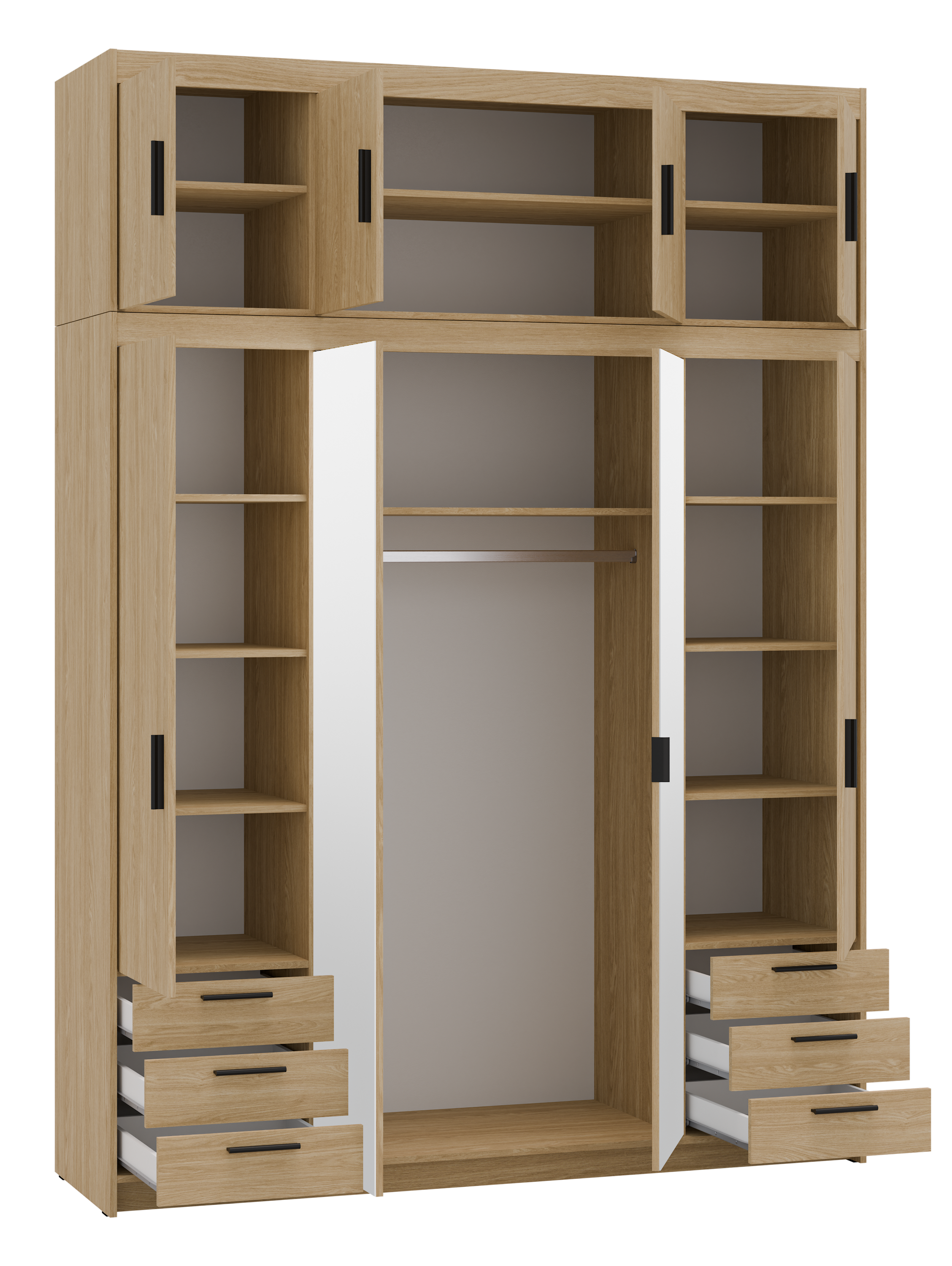 Nadstawka na szafę 4-drzwiowa o szerokości 176 cm. Nadstawka dostępna w kolorze biały mat, dąb lefkas, dąb olejowany, beż piaskowy oraz dąb sonoma. Pasuje do szafy Trino 4-drzwiowej z lustrem lub bez. Wykonana z wysokiej jakości płyty laminowanej 16 mm. Krawędzie oklejone obrzeżem ABS. Uchwyty wykonane z tworzywa sztucznego. Produkt w 100 % polski. Meble pakowane w paczki - do samodzielnego montażu. Do zestawu dołączona przejrzysta instrukcja.