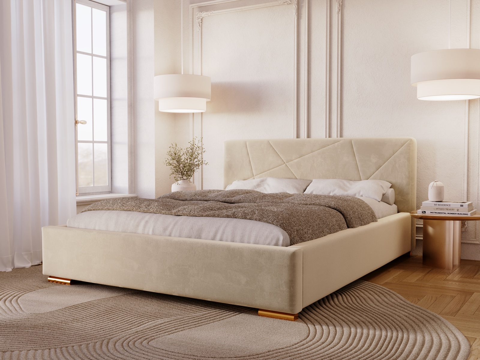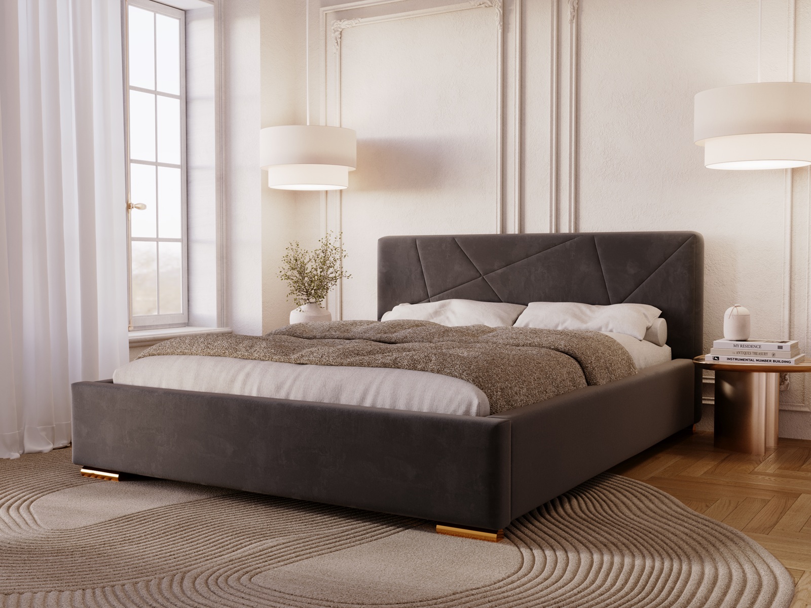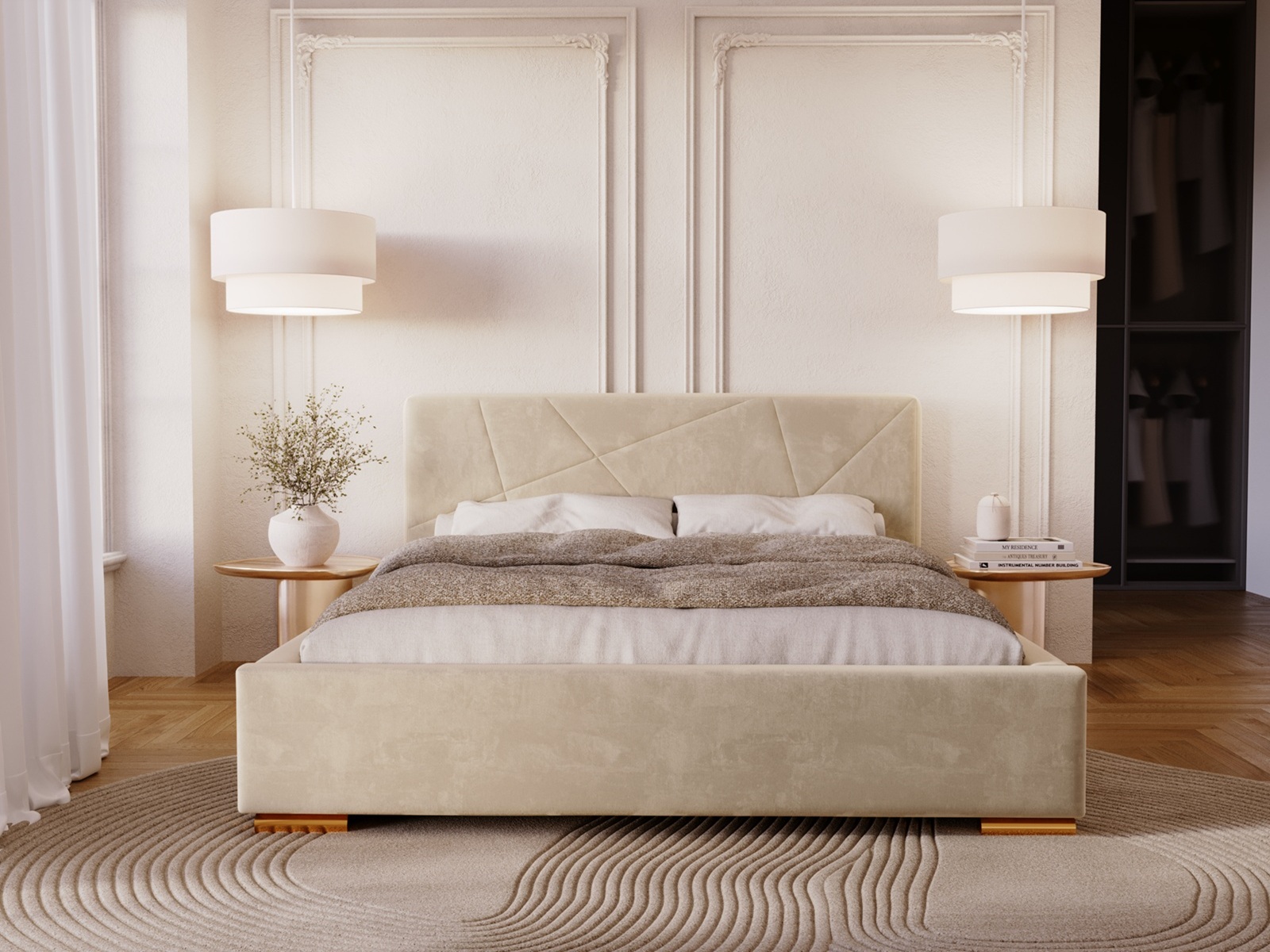 Łóżko tapicerowane DIORA to wyjątkowy mebel stworzony z myślą o osobach, które oczekują czegoś więcej niż standardowego wyposażenia sypialni. To harmonijne połączenie eleganckiego wzornictwa, najwyższej jakości materiałów oraz praktycznych rozwiązań, które podnoszą komfort codziennego użytkowania. Centralnym punktem łóżka jest efektowne wezgłowie z nowoczesnymi, geometrycznymi przeszyciami. Dzięki zastosowaniu zaawansowanej technologii szycia na piance, wzór jest idealnie równy, trwały i niezwykle estetyczny. To detal, który nadaje wnętrzu prestiżowego charakteru i sprawia, że łóżko staje się główną ozdobą sypialni.
