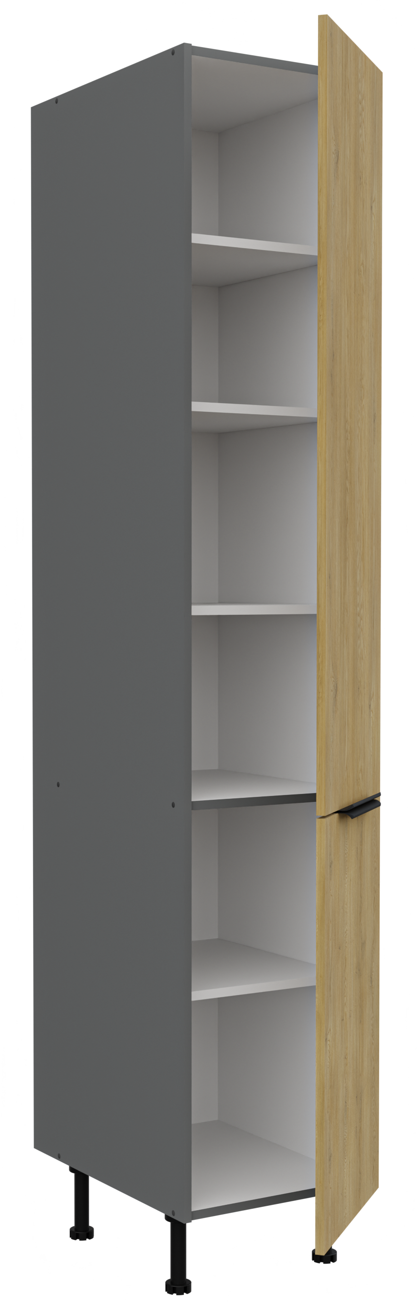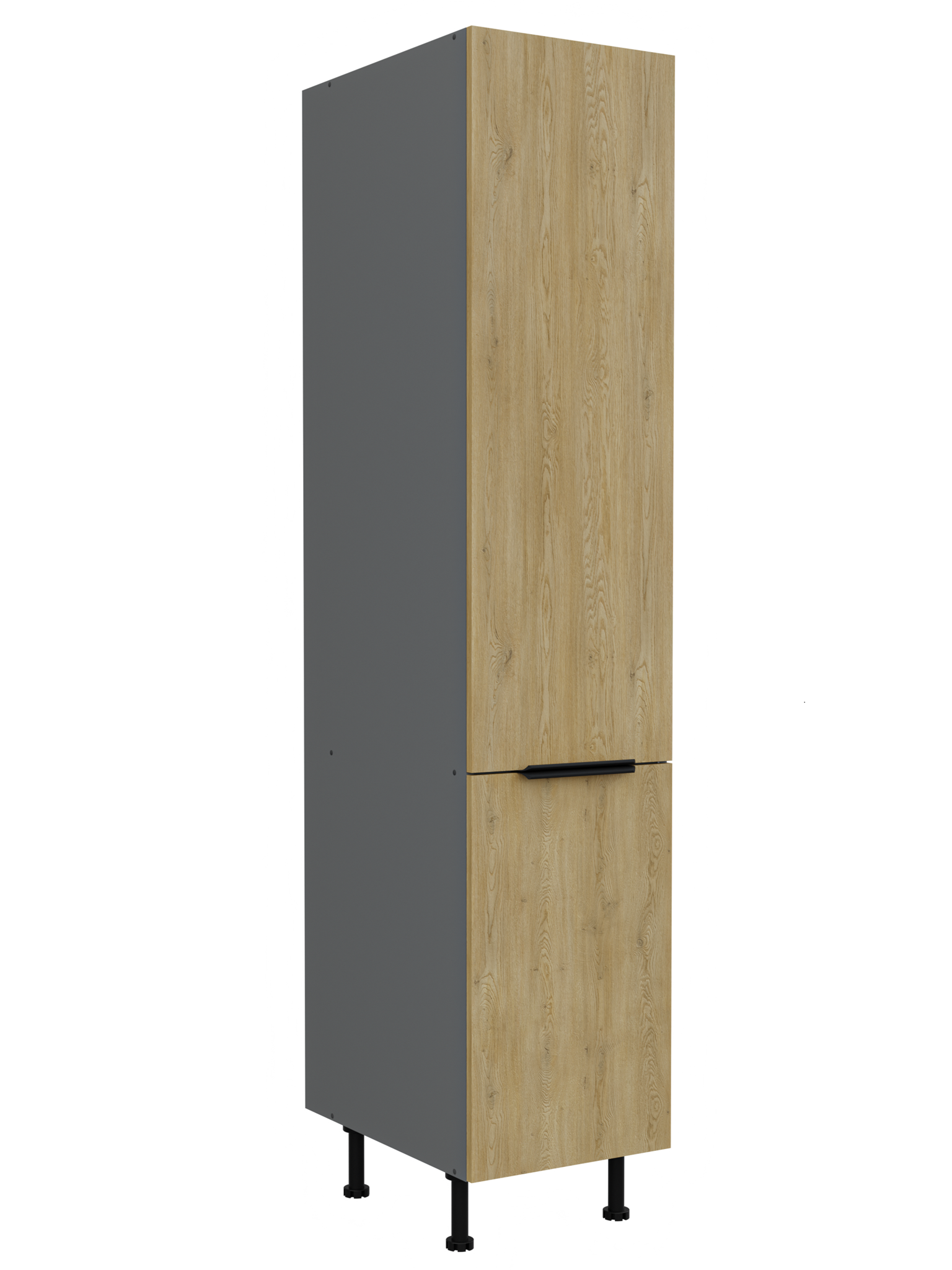Kolekcja kuchenna CREMA to połączenie minimalistycznego designu z ciepłem naturalnego drewna. Fronty w delikatnym, drewnopodobnym wykończeniu harmonizują z matowymi, antracytowymi akcentami, tworząc elegancką i ponadczasową przestrzeń. Geometryczne linie i proste uchwyty podkreślają nowoczesny charakter kolekcji, a przemyślane rozmieszczenie szafek zapewnia maksymalną funkcjonalność nawet w kompaktowej zabudowie. CREMA to idealny wybór dla osób, które cenią praktyczne rozwiązania, subtelną estetykę i ponadczasowy styl. Kolekcja posiada czarne uchwyty aluminiowe, które dodają elegancji i stylu. Dzięki systemowi cichego domykania frontów i szuflad, korzystanie z mebli jest wygodne oraz ergonomiczne. Dodatkowym atutem są regulowane nogi. Meble kuchenne CREMA to doskonały wybór dla osób poszukujących nowoczesnego i funkcjonalnego wystroju kuchni. Szafki jednodrzwiowe są uniwersalne, o stronie otwierania można zdecydować przy montażu. Miejsca na uchwyty naznaczone nieprzelotowo od wewnątrz. Meble do samodzielnego montażu, według przejrzystej instrukcji.