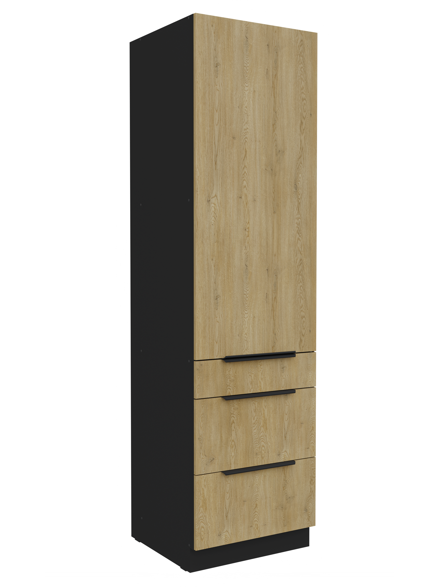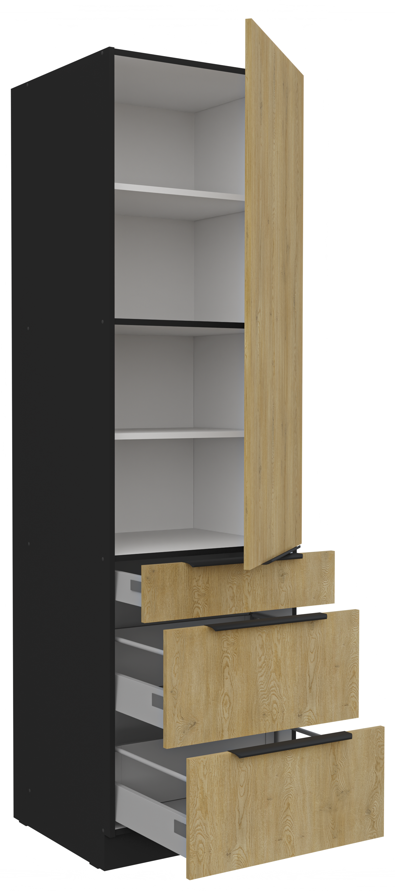 Kolekcja kuchenna CREMA to połączenie minimalistycznego designu z ciepłem naturalnego drewna. Fronty w delikatnym, drewnopodobnym wykończeniu harmonizują z matowymi, czarnymi akcentami, tworząc elegancką i ponadczasową przestrzeń. Geometryczne linie i proste uchwyty podkreślają nowoczesny charakter kolekcji, a przemyślane rozmieszczenie szafek zapewnia maksymalną funkcjonalność nawet w kompaktowej zabudowie. CREMA to idealny wybór dla osób, które cenią praktyczne rozwiązania, subtelną estetykę i ponadczasowy styl. Kolekcja posiada czarne uchwyty aluminiowe, które dodają elegancji i stylu. Dzięki systemowi cichego domykania frontów i szuflad, korzystanie z mebli jest wygodne oraz ergonomiczne. Meble kuchenne CREMA to doskonały wybór dla osób poszukujących nowoczesnego i funkcjonalnego wystroju kuchni. Szafki jednodrzwiowe są uniwersalne, o stronie otwierania można zdecydować przy montażu. Miejsca na uchwyty naznaczone nieprzelotowo od wewnątrz. Meble do samodzielnego montażu, według przejrzystej instrukcji.