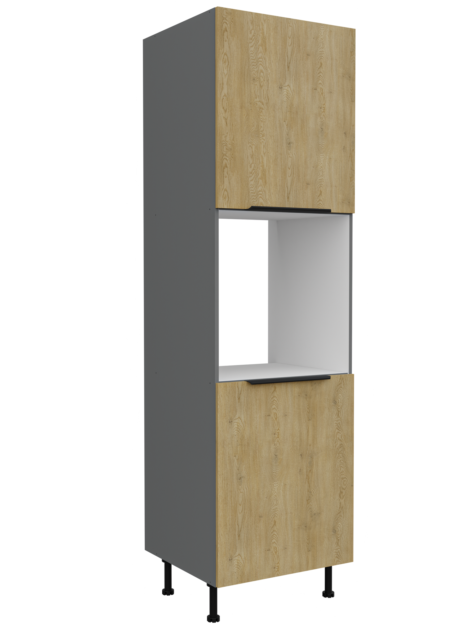 Kolekcja kuchenna CREMA to połączenie minimalistycznego designu z ciepłem naturalnego drewna. Fronty w delikatnym, drewnopodobnym wykończeniu harmonizują z matowymi, antracytowymi akcentami, tworząc elegancką i ponadczasową przestrzeń. Geometryczne linie i proste uchwyty podkreślają nowoczesny charakter kolekcji, a przemyślane rozmieszczenie szafek zapewnia maksymalną funkcjonalność nawet w kompaktowej zabudowie. CREMA to idealny wybór dla osób, które cenią praktyczne rozwiązania, subtelną estetykę i ponadczasowy styl. Kolekcja posiada czarne uchwyty aluminiowe, które dodają elegancji i stylu. Dzięki systemowi cichego domykania frontów i szuflad, korzystanie z mebli jest wygodne oraz ergonomiczne. Dodatkowym atutem są regulowane nogi. Meble kuchenne CREMA to doskonały wybór dla osób poszukujących nowoczesnego i funkcjonalnego wystroju kuchni. Szafki jednodrzwiowe są uniwersalne, o stronie otwierania można zdecydować przy montażu. Miejsca na uchwyty naznaczone nieprzelotowo od wewnątrz. Meble do samodzielnego montażu, według przejrzystej instrukcji.