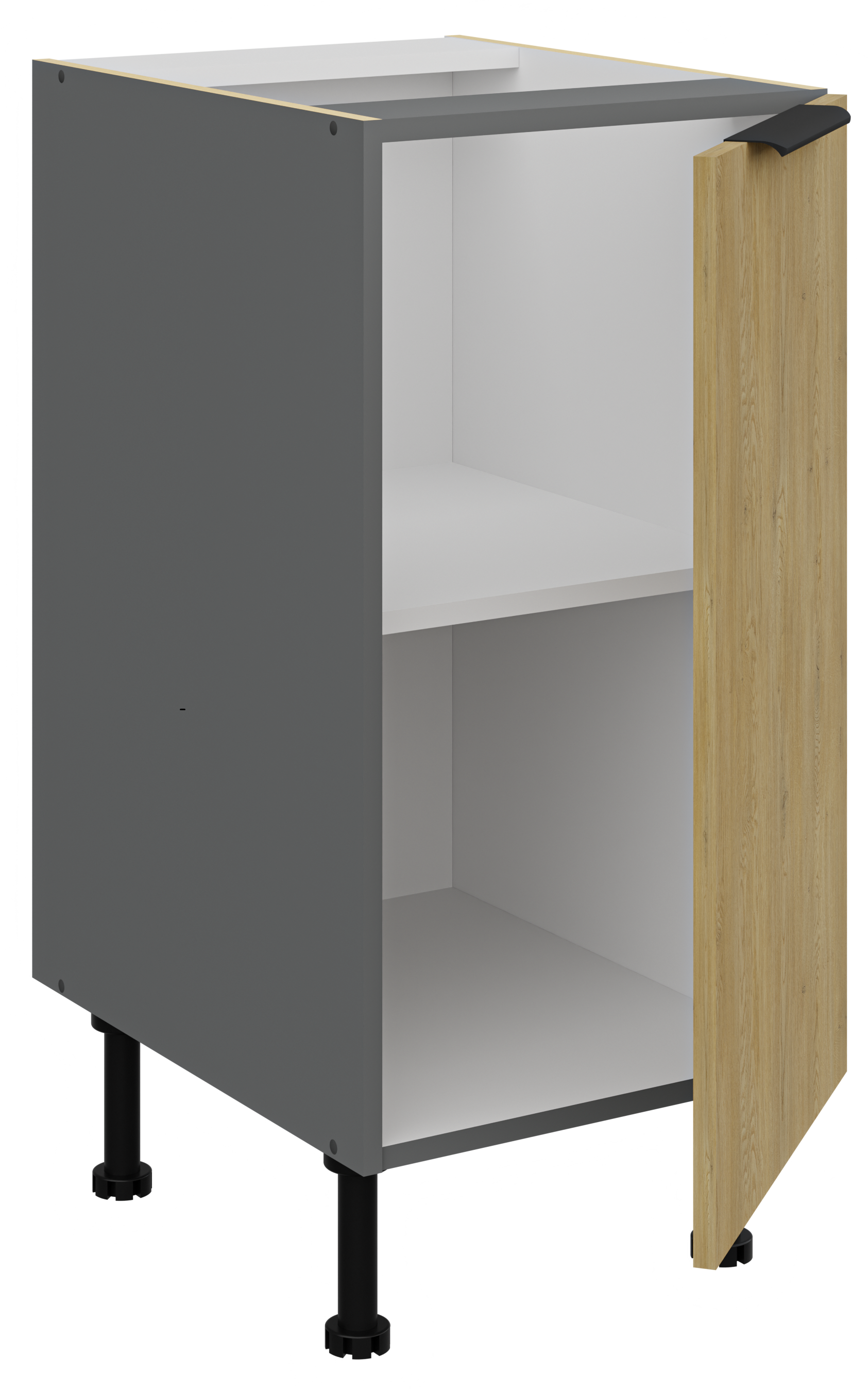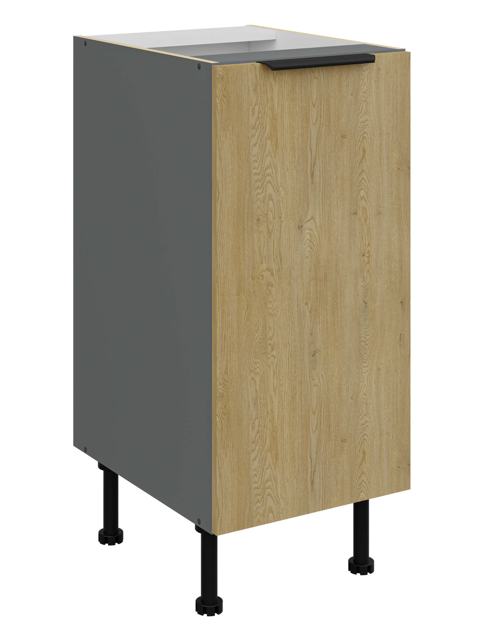 Kolekcja kuchenna CREMA to połączenie minimalistycznego designu z ciepłem naturalnego drewna. Fronty w delikatnym, drewnopodobnym wykończeniu harmonizują z matowymi, antracytowymi akcentami, tworząc elegancką i ponadczasową przestrzeń. Geometryczne linie i proste uchwyty podkreślają nowoczesny charakter kolekcji, a przemyślane rozmieszczenie szafek zapewnia maksymalną funkcjonalność nawet w kompaktowej zabudowie. CREMA to idealny wybór dla osób, które cenią praktyczne rozwiązania, subtelną estetykę i ponadczasowy styl. Kolekcja posiada czarne uchwyty aluminiowe, które dodają elegancji i stylu. Dzięki systemowi cichego domykania frontów i szuflad, korzystanie z mebli jest wygodne oraz ergonomiczne. Dodatkowym atutem są regulowane nogi. Meble kuchenne CREMA to doskonały wybór dla osób poszukujących nowoczesnego i funkcjonalnego wystroju kuchni. Szafki jednodrzwiowe są uniwersalne, o stronie otwierania można zdecydować przy montażu. Miejsca na uchwyty naznaczone nieprzelotowo od wewnątrz. Meble do samodzielnego montażu, według przejrzystej instrukcji.