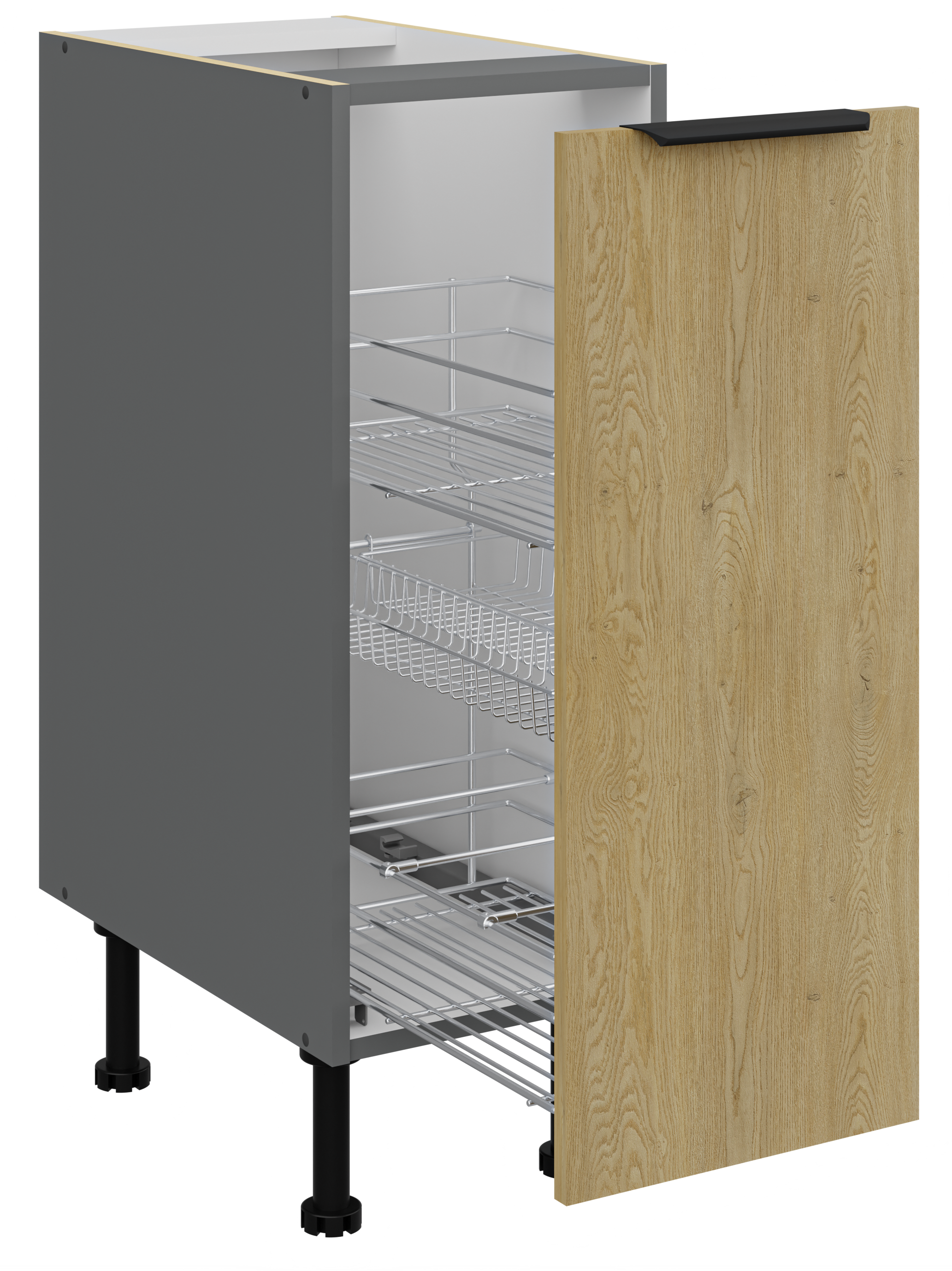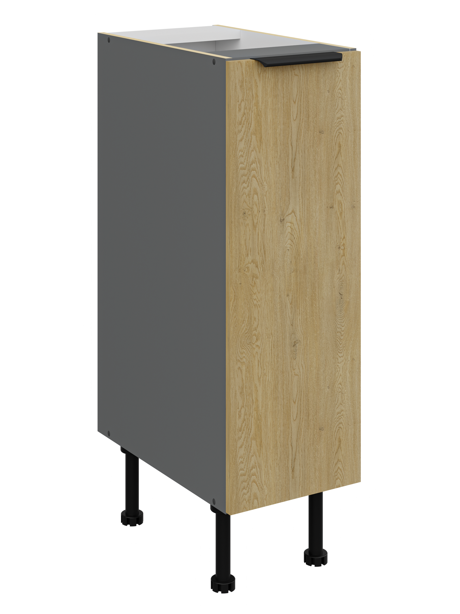 Kolekcja kuchenna CREMA to połączenie minimalistycznego designu z ciepłem naturalnego drewna. Fronty w delikatnym, drewnopodobnym wykończeniu harmonizują z matowymi, antracytowymi akcentami, tworząc elegancką i ponadczasową przestrzeń. Geometryczne linie i proste uchwyty podkreślają nowoczesny charakter kolekcji, a przemyślane rozmieszczenie szafek zapewnia maksymalną funkcjonalność nawet w kompaktowej zabudowie. CREMA to idealny wybór dla osób, które cenią praktyczne rozwiązania, subtelną estetykę i ponadczasowy styl. Kolekcja posiada czarne uchwyty aluminiowe, które dodają elegancji i stylu. Dzięki systemowi cichego domykania frontów i szuflad, korzystanie z mebli jest wygodne oraz ergonomiczne. Dodatkowym atutem są regulowane nogi. Meble kuchenne CREMA to doskonały wybór dla osób poszukujących nowoczesnego i funkcjonalnego wystroju kuchni. Szafki jednodrzwiowe są uniwersalne, o stronie otwierania można zdecydować przy montażu. Miejsca na uchwyty naznaczone nieprzelotowo od wewnątrz. Meble do samodzielnego montażu, według przejrzystej instrukcji.