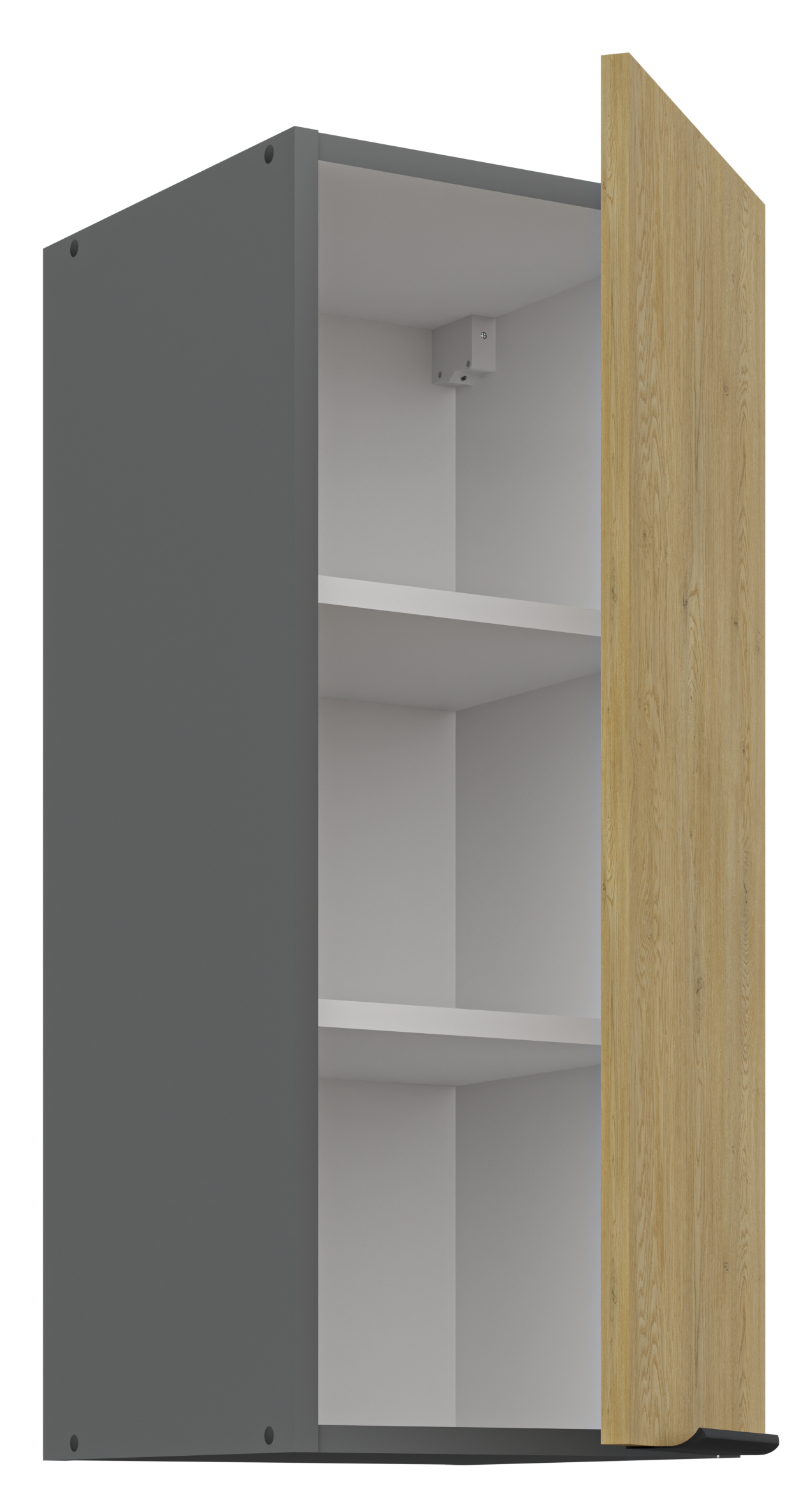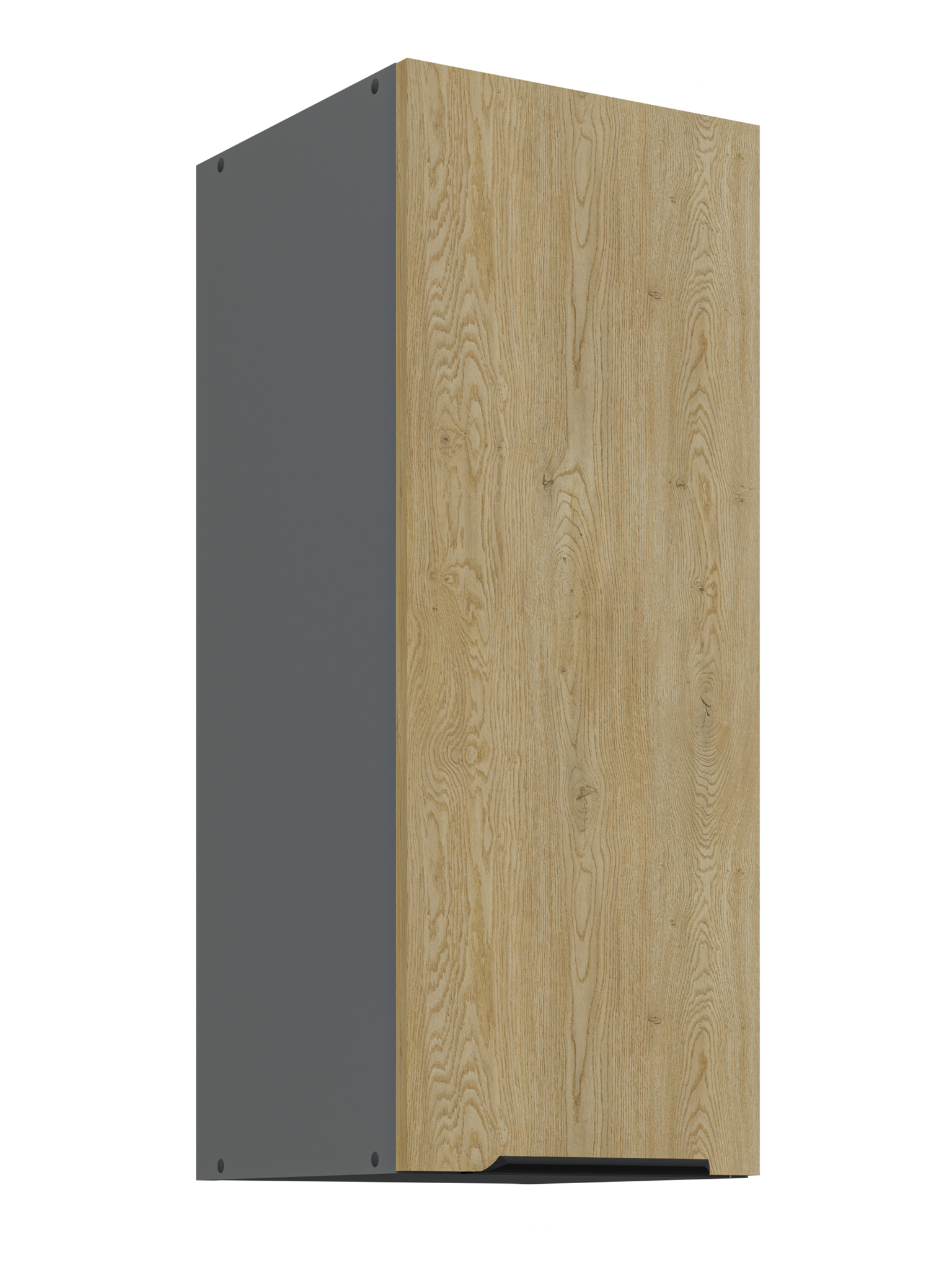 Kolekcja kuchenna CREMA to połączenie minimalistycznego designu z ciepłem naturalnego drewna. Fronty w delikatnym, drewnopodobnym wykończeniu harmonizują z matowymi, antracytowymi akcentami, tworząc elegancką i ponadczasową przestrzeń. Geometryczne linie i proste uchwyty podkreślają nowoczesny charakter kolekcji, a przemyślane rozmieszczenie szafek zapewnia maksymalną funkcjonalność nawet w kompaktowej zabudowie. CREMA to idealny wybór dla osób, które cenią praktyczne rozwiązania, subtelną estetykę i ponadczasowy styl. Kolekcja posiada czarne uchwyty aluminiowe, które dodają elegancji i stylu. Dzięki systemowi cichego domykania frontów i szuflad, korzystanie z mebli jest wygodne oraz ergonomiczne. Dodatkowym atutem są regulowane nogi. Meble kuchenne CREMA to doskonały wybór dla osób poszukujących nowoczesnego i funkcjonalnego wystroju kuchni. Szafki jednodrzwiowe są uniwersalne, o stronie otwierania można zdecydować przy montażu. Miejsca na uchwyty naznaczone nieprzelotowo od wewnątrz. Meble do samodzielnego montażu, według przejrzystej instrukcji.