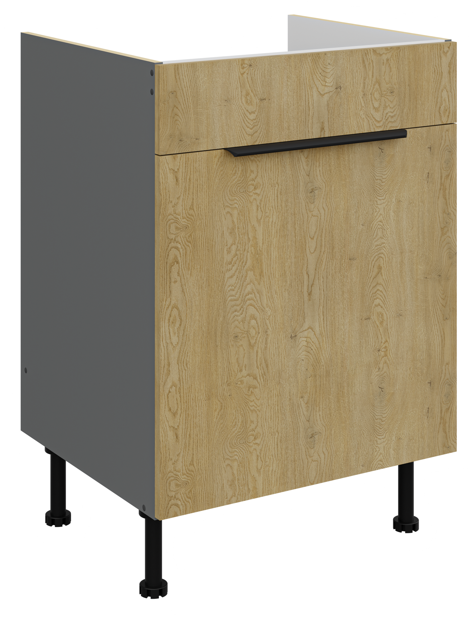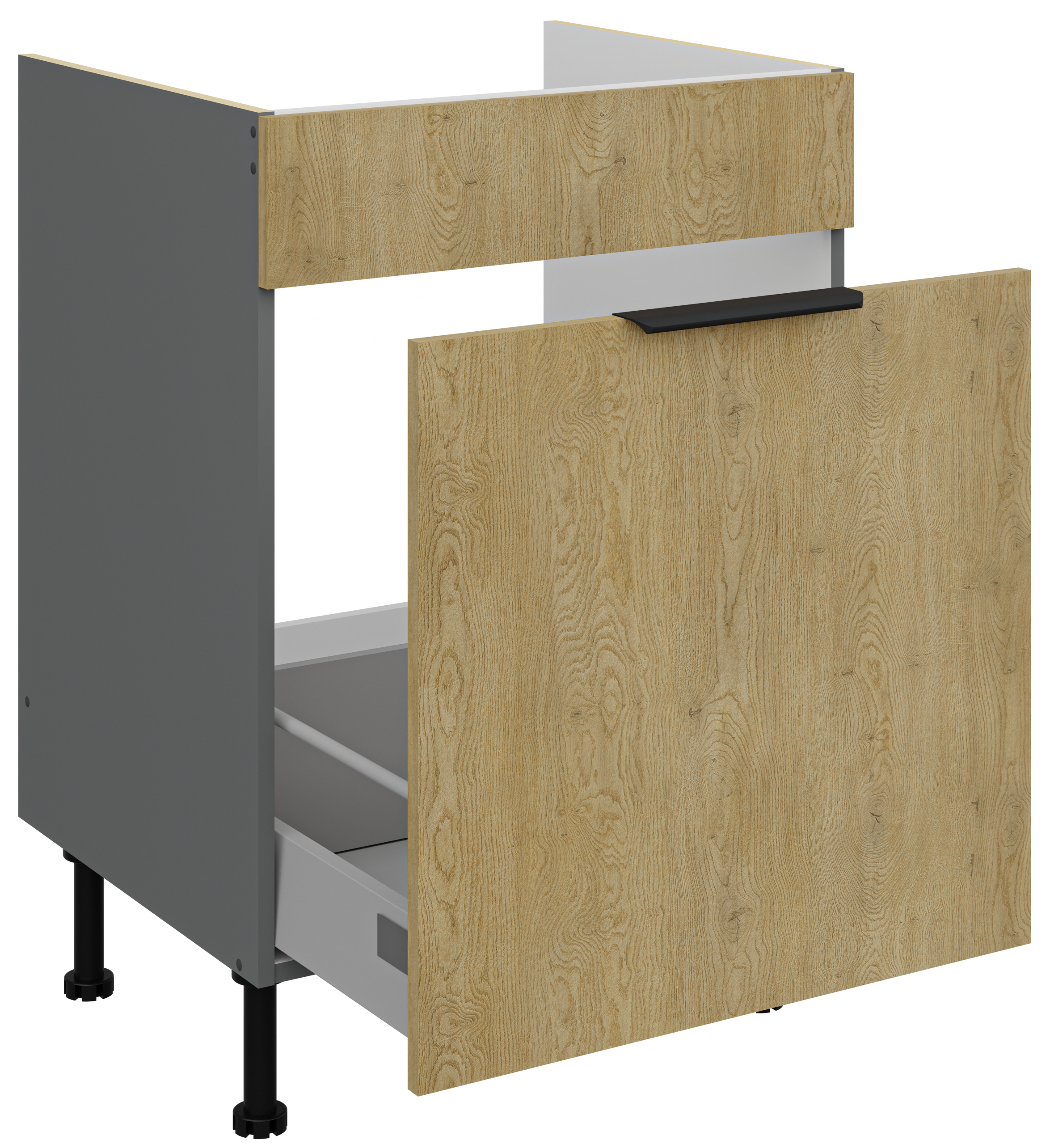 Kolekcja kuchenna CREMA to połączenie minimalistycznego designu z ciepłem naturalnego drewna. Fronty w delikatnym, drewnopodobnym wykończeniu harmonizują z matowymi, antracytowymi akcentami, tworząc elegancką i ponadczasową przestrzeń. Geometryczne linie i proste uchwyty podkreślają nowoczesny charakter kolekcji, a przemyślane rozmieszczenie szafek zapewnia maksymalną funkcjonalność nawet w kompaktowej zabudowie. CREMA to idealny wybór dla osób, które cenią praktyczne rozwiązania, subtelną estetykę i ponadczasowy styl. Kolekcja posiada czarne uchwyty aluminiowe, które dodają elegancji i stylu. Dzięki systemowi cichego domykania frontów i szuflad, korzystanie z mebli jest wygodne oraz ergonomiczne. Dodatkowym atutem są regulowane nogi. Meble kuchenne CREMA to doskonały wybór dla osób poszukujących nowoczesnego i funkcjonalnego wystroju kuchni. Szafki jednodrzwiowe są uniwersalne, o stronie otwierania można zdecydować przy montażu. Miejsca na uchwyty naznaczone nieprzelotowo od wewnątrz. Meble do samodzielnego montażu, według przejrzystej instrukcji.