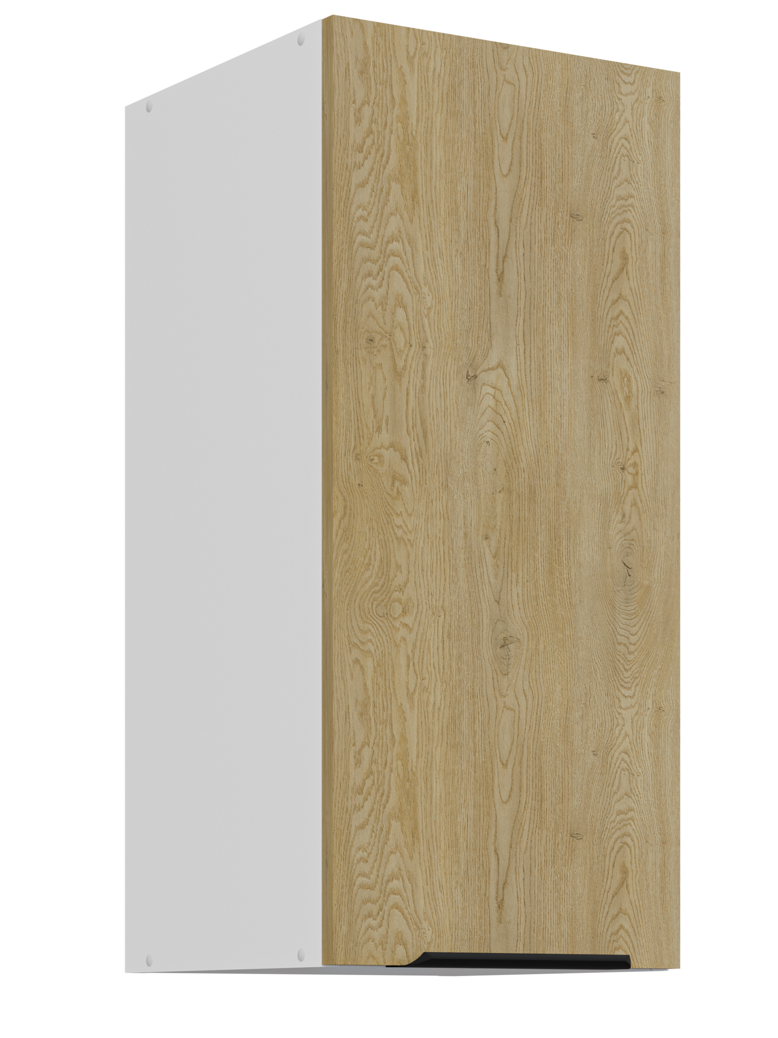 Kolekcja kuchenna CREMA to połączenie minimalistycznego designu z ciepłem naturalnego drewna. Fronty w delikatnym, drewnopodobnym wykończeniu harmonizują z matowymi, białymi akcentami, tworząc elegancką i ponadczasową przestrzeń. Geometryczne linie i proste uchwyty podkreślają nowoczesny charakter kolekcji, a przemyślane rozmieszczenie szafek zapewnia maksymalną funkcjonalność nawet w kompaktowej zabudowie. CREMA to idealny wybór dla osób, które cenią praktyczne rozwiązania, subtelną estetykę i ponadczasowy styl. Kolekcja posiada czarne uchwyty aluminiowe, które dodają elegancji i stylu. Dzięki systemowi cichego domykania frontów i szuflad, korzystanie z mebli jest wygodne oraz ergonomiczne. Meble kuchenne CREMA to doskonały wybór dla osób poszukujących nowoczesnego i funkcjonalnego wystroju kuchni. Szafki jednodrzwiowe są uniwersalne, o stronie otwierania można zdecydować przy montażu. Miejsca na uchwyty naznaczone nieprzelotowo od wewnątrz. Meble do samodzielnego montażu, według przejrzystej instrukcji.