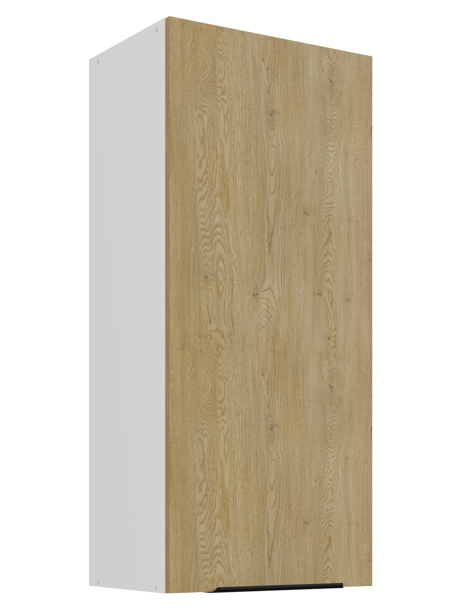 Kolekcja kuchenna CREMA to połączenie minimalistycznego designu z ciepłem naturalnego drewna. Fronty w delikatnym, drewnopodobnym wykończeniu harmonizują z matowymi, białymi akcentami, tworząc elegancką i ponadczasową przestrzeń. Geometryczne linie i proste uchwyty podkreślają nowoczesny charakter kolekcji, a przemyślane rozmieszczenie szafek zapewnia maksymalną funkcjonalność nawet w kompaktowej zabudowie. CREMA to idealny wybór dla osób, które cenią praktyczne rozwiązania, subtelną estetykę i ponadczasowy styl. Kolekcja posiada czarne uchwyty aluminiowe, które dodają elegancji i stylu. Dzięki systemowi cichego domykania frontów i szuflad, korzystanie z mebli jest wygodne oraz ergonomiczne. Meble kuchenne CREMA to doskonały wybór dla osób poszukujących nowoczesnego i funkcjonalnego wystroju kuchni. Szafki jednodrzwiowe są uniwersalne, o stronie otwierania można zdecydować przy montażu. Miejsca na uchwyty naznaczone nieprzelotowo od wewnątrz. Meble do samodzielnego montażu, według przejrzystej instrukcji.