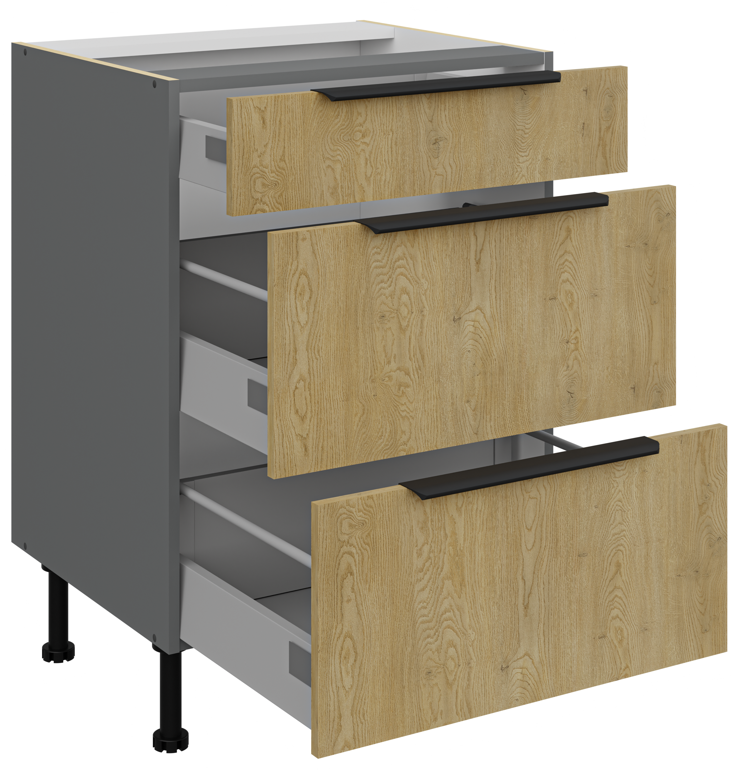 Kolekcja kuchenna CREMA to połączenie minimalistycznego designu z ciepłem naturalnego drewna. Fronty w delikatnym, drewnopodobnym wykończeniu harmonizują z matowymi, antracytowymi akcentami, tworząc elegancką i ponadczasową przestrzeń. Geometryczne linie i proste uchwyty podkreślają nowoczesny charakter kolekcji, a przemyślane rozmieszczenie szafek zapewnia maksymalną funkcjonalność nawet w kompaktowej zabudowie. CREMA to idealny wybór dla osób, które cenią praktyczne rozwiązania, subtelną estetykę i ponadczasowy styl. Kolekcja posiada czarne uchwyty aluminiowe, które dodają elegancji i stylu. Dzięki systemowi cichego domykania frontów i szuflad, korzystanie z mebli jest wygodne oraz ergonomiczne. Dodatkowym atutem są regulowane nogi. Meble kuchenne CREMA to doskonały wybór dla osób poszukujących nowoczesnego i funkcjonalnego wystroju kuchni. Szafki jednodrzwiowe są uniwersalne, o stronie otwierania można zdecydować przy montażu. Miejsca na uchwyty naznaczone nieprzelotowo od wewnątrz. Meble do samodzielnego montażu, według przejrzystej instrukcji.