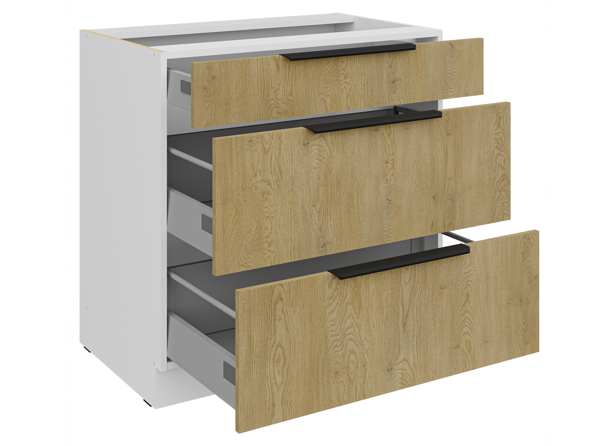 Kolekcja kuchenna CREMA to połączenie minimalistycznego designu z ciepłem naturalnego drewna. Fronty w delikatnym, drewnopodobnym wykończeniu harmonizują z matowymi, białymi akcentami, tworząc elegancką i ponadczasową przestrzeń. Geometryczne linie i proste uchwyty podkreślają nowoczesny charakter kolekcji, a przemyślane rozmieszczenie szafek zapewnia maksymalną funkcjonalność nawet w kompaktowej zabudowie. CREMA to idealny wybór dla osób, które cenią praktyczne rozwiązania, subtelną estetykę i ponadczasowy styl. Kolekcja posiada czarne uchwyty aluminiowe, które dodają elegancji i stylu. Dzięki systemowi cichego domykania frontów i szuflad, korzystanie z mebli jest wygodne oraz ergonomiczne. Meble kuchenne CREMA to doskonały wybór dla osób poszukujących nowoczesnego i funkcjonalnego wystroju kuchni. Szafki jednodrzwiowe są uniwersalne, o stronie otwierania można zdecydować przy montażu. Miejsca na uchwyty naznaczone nieprzelotowo od wewnątrz. Meble do samodzielnego montażu, według przejrzystej instrukcji.