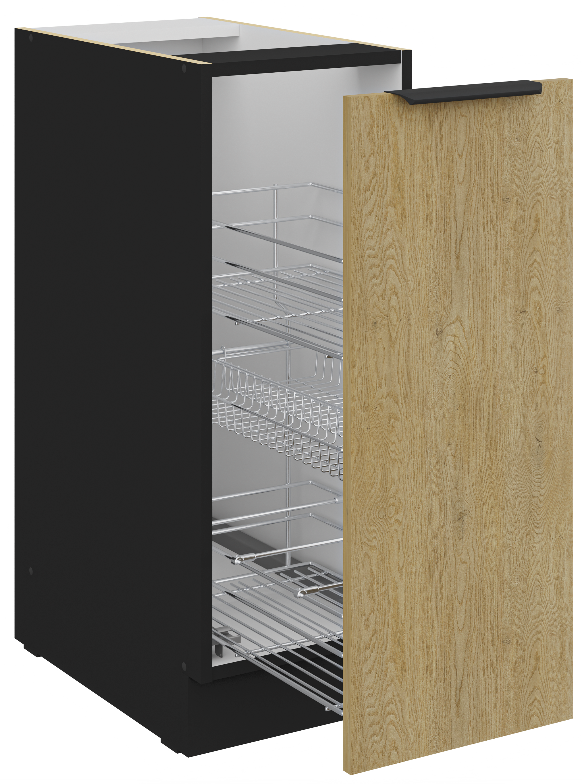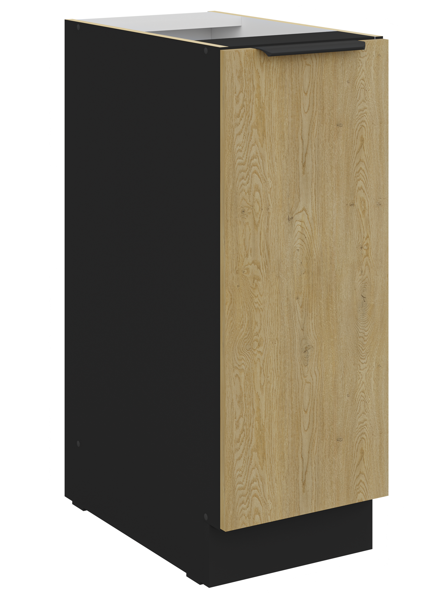 Kolekcja kuchenna CREMA to połączenie minimalistycznego designu z ciepłem naturalnego drewna. Fronty w delikatnym, drewnopodobnym wykończeniu harmonizują z matowymi, czarnymi akcentami, tworząc elegancką i ponadczasową przestrzeń. Geometryczne linie i proste uchwyty podkreślają nowoczesny charakter kolekcji, a przemyślane rozmieszczenie szafek zapewnia maksymalną funkcjonalność nawet w kompaktowej zabudowie. CREMA to idealny wybór dla osób, które cenią praktyczne rozwiązania, subtelną estetykę i ponadczasowy styl. Kolekcja posiada czarne uchwyty aluminiowe, które dodają elegancji i stylu. Dzięki systemowi cichego domykania frontów i szuflad, korzystanie z mebli jest wygodne oraz ergonomiczne. Meble kuchenne CREMA to doskonały wybór dla osób poszukujących nowoczesnego i funkcjonalnego wystroju kuchni. Szafki jednodrzwiowe są uniwersalne, o stronie otwierania można zdecydować przy montażu. Miejsca na uchwyty naznaczone nieprzelotowo od wewnątrz. Meble do samodzielnego montażu, według przejrzystej instrukcji.