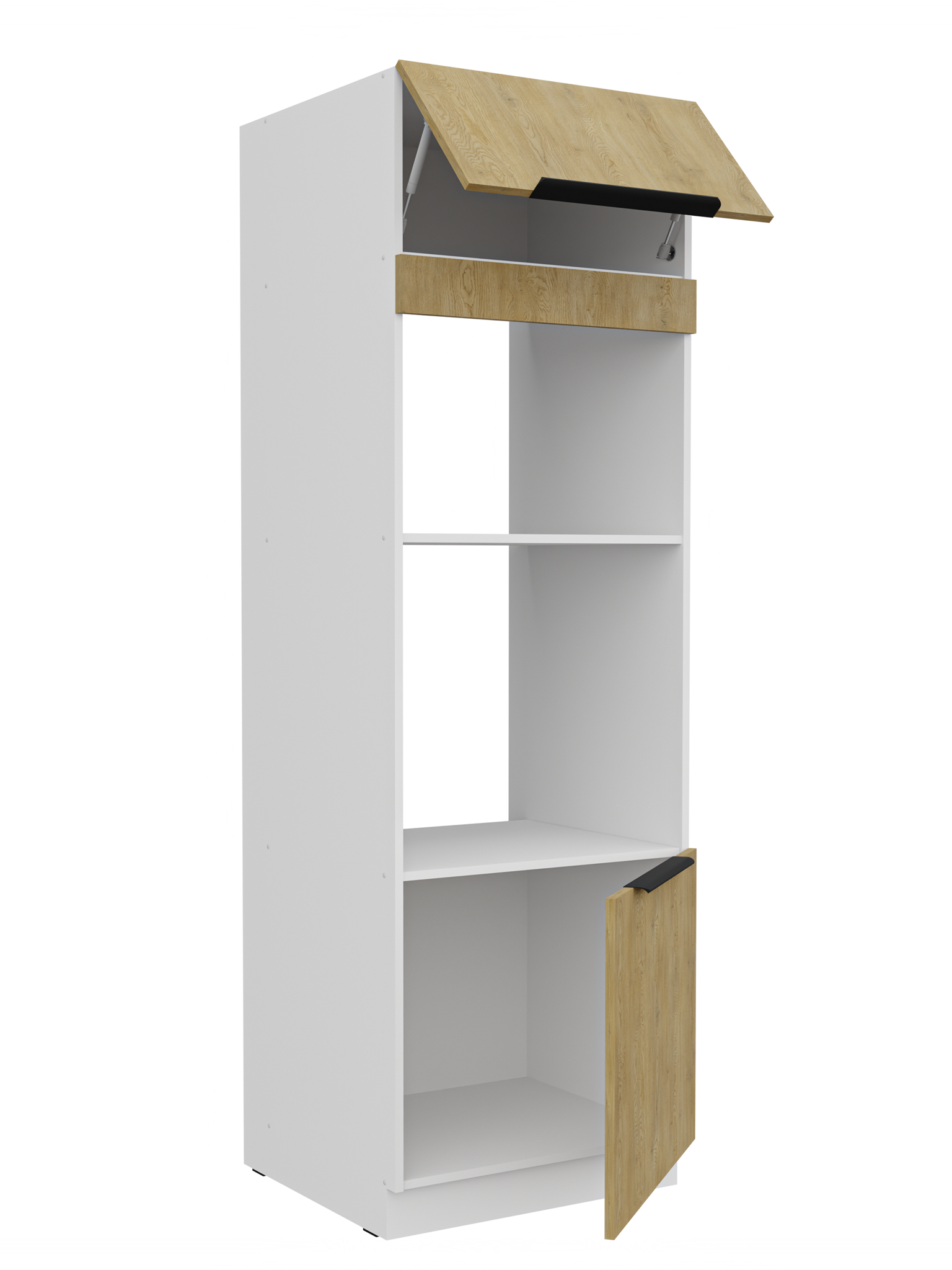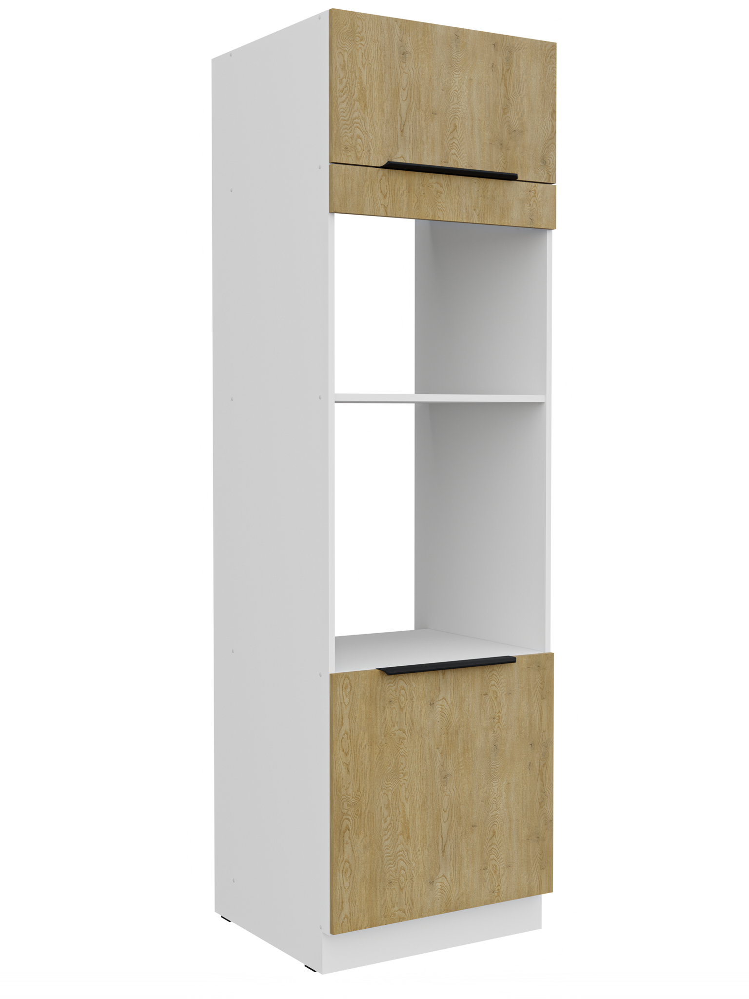 Kolekcja kuchenna CREMA to połączenie minimalistycznego designu z ciepłem naturalnego drewna. Fronty w delikatnym, drewnopodobnym wykończeniu harmonizują z matowymi, białymi akcentami, tworząc elegancką i ponadczasową przestrzeń. Geometryczne linie i proste uchwyty podkreślają nowoczesny charakter kolekcji, a przemyślane rozmieszczenie szafek zapewnia maksymalną funkcjonalność nawet w kompaktowej zabudowie. CREMA to idealny wybór dla osób, które cenią praktyczne rozwiązania, subtelną estetykę i ponadczasowy styl. Kolekcja posiada czarne uchwyty aluminiowe, które dodają elegancji i stylu. Dzięki systemowi cichego domykania frontów i szuflad, korzystanie z mebli jest wygodne oraz ergonomiczne. Meble kuchenne CREMA to doskonały wybór dla osób poszukujących nowoczesnego i funkcjonalnego wystroju kuchni. Szafki jednodrzwiowe są uniwersalne, o stronie otwierania można zdecydować przy montażu. Miejsca na uchwyty naznaczone nieprzelotowo od wewnątrz. Meble do samodzielnego montażu, według przejrzystej instrukcji.