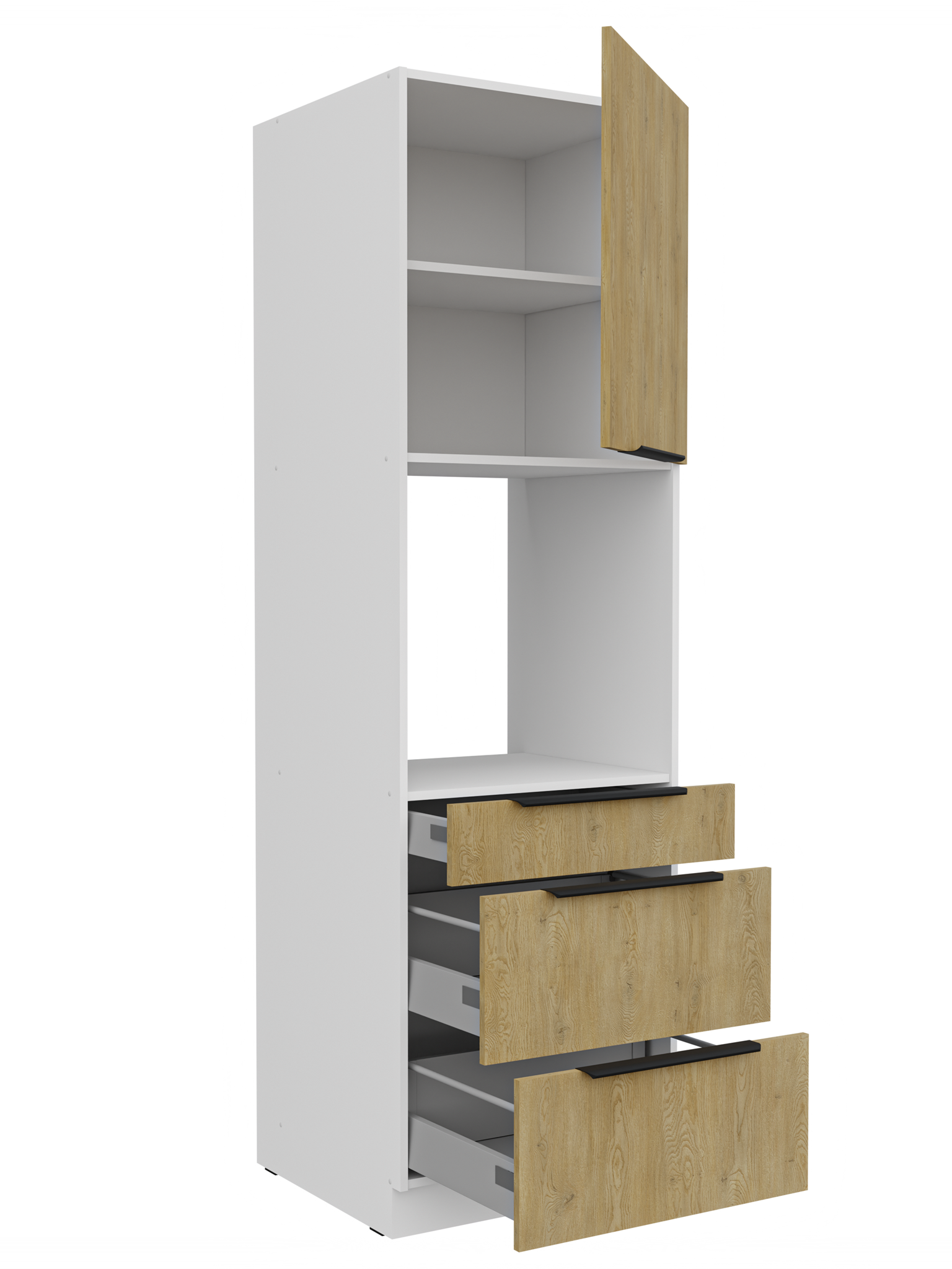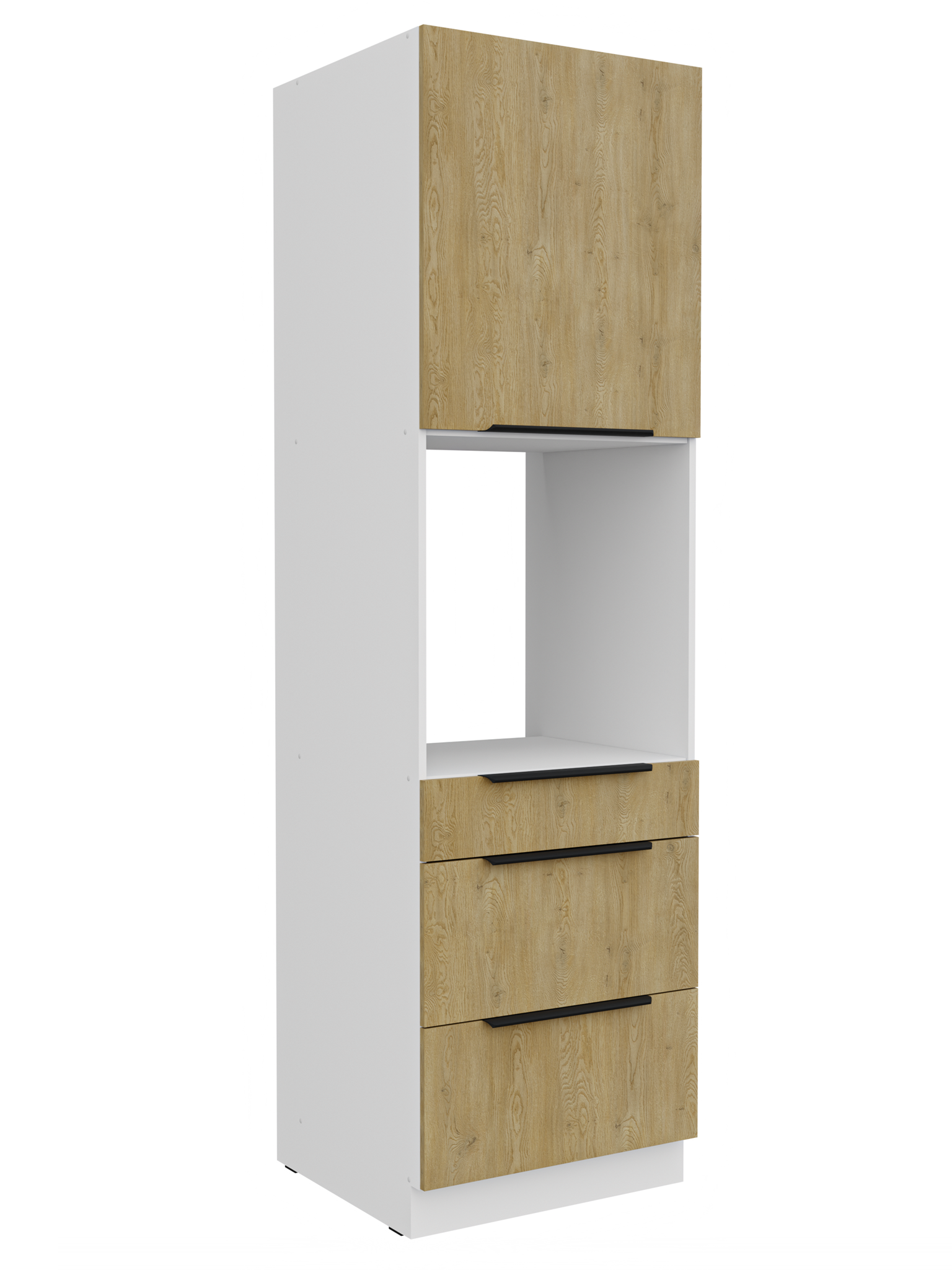 Kolekcja kuchenna CREMA to połączenie minimalistycznego designu z ciepłem naturalnego drewna. Fronty w delikatnym, drewnopodobnym wykończeniu harmonizują z matowymi, białymi akcentami, tworząc elegancką i ponadczasową przestrzeń. Geometryczne linie i proste uchwyty podkreślają nowoczesny charakter kolekcji, a przemyślane rozmieszczenie szafek zapewnia maksymalną funkcjonalność nawet w kompaktowej zabudowie. CREMA to idealny wybór dla osób, które cenią praktyczne rozwiązania, subtelną estetykę i ponadczasowy styl. Kolekcja posiada czarne uchwyty aluminiowe, które dodają elegancji i stylu. Dzięki systemowi cichego domykania frontów i szuflad, korzystanie z mebli jest wygodne oraz ergonomiczne. Meble kuchenne CREMA to doskonały wybór dla osób poszukujących nowoczesnego i funkcjonalnego wystroju kuchni. Szafki jednodrzwiowe są uniwersalne, o stronie otwierania można zdecydować przy montażu. Miejsca na uchwyty naznaczone nieprzelotowo od wewnątrz. Meble do samodzielnego montażu, według przejrzystej instrukcji.