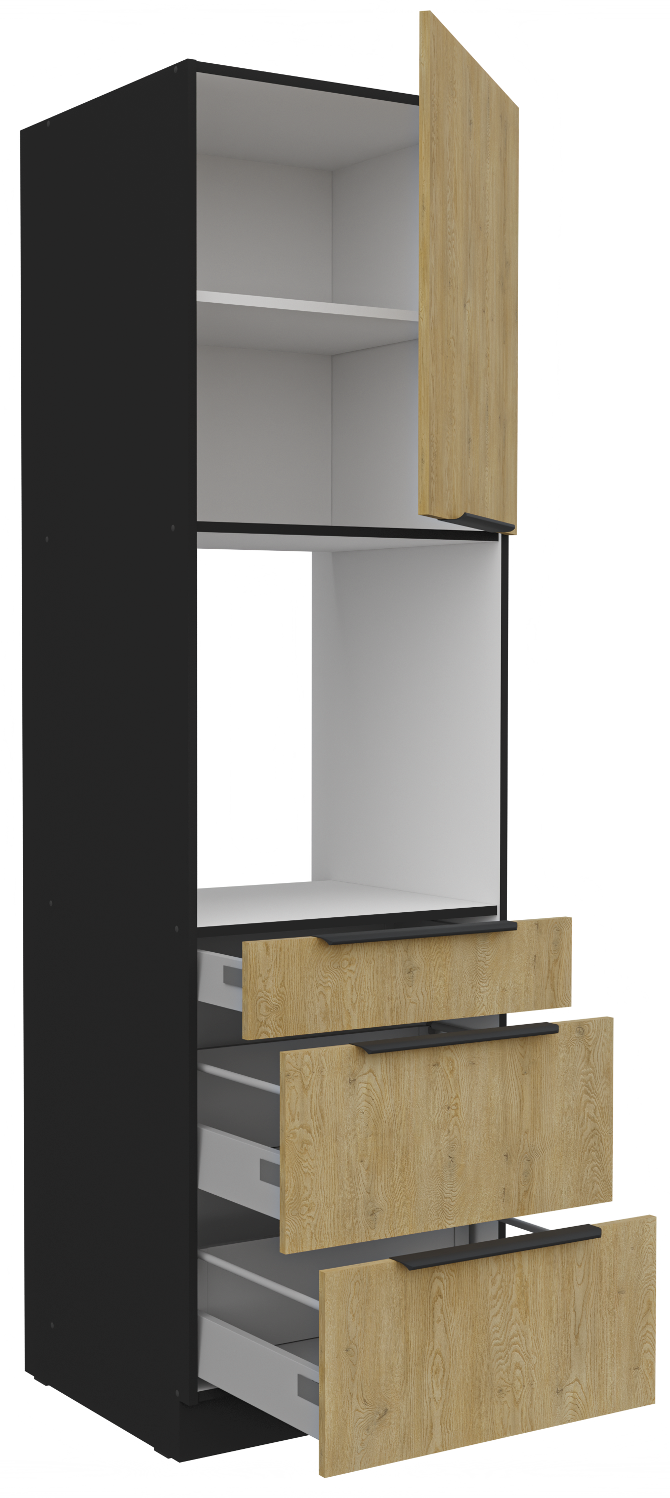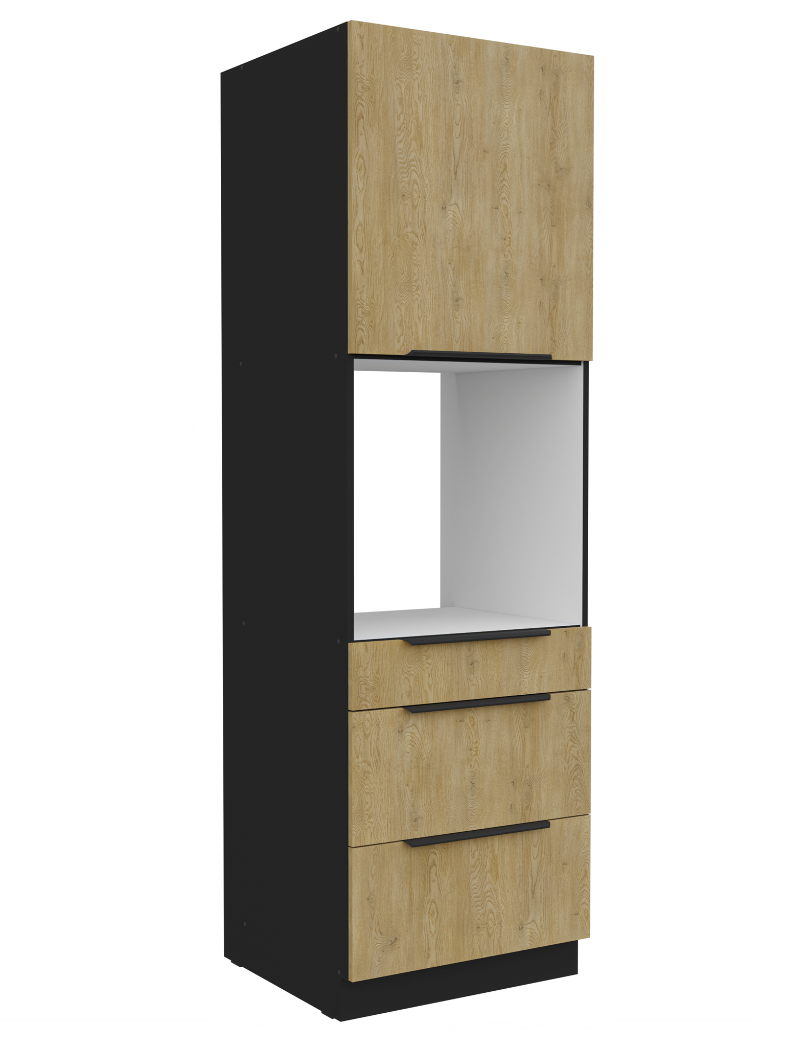Kolekcja kuchenna CREMA to połączenie minimalistycznego designu z ciepłem naturalnego drewna. Fronty w delikatnym, drewnopodobnym wykończeniu harmonizują z matowymi, czarnymi akcentami, tworząc elegancką i ponadczasową przestrzeń. Geometryczne linie i proste uchwyty podkreślają nowoczesny charakter kolekcji, a przemyślane rozmieszczenie szafek zapewnia maksymalną funkcjonalność nawet w kompaktowej zabudowie. CREMA to idealny wybór dla osób, które cenią praktyczne rozwiązania, subtelną estetykę i ponadczasowy styl. Kolekcja posiada czarne uchwyty aluminiowe, które dodają elegancji i stylu. Dzięki systemowi cichego domykania frontów i szuflad, korzystanie z mebli jest wygodne oraz ergonomiczne. Meble kuchenne CREMA to doskonały wybór dla osób poszukujących nowoczesnego i funkcjonalnego wystroju kuchni. Szafki jednodrzwiowe są uniwersalne, o stronie otwierania można zdecydować przy montażu. Miejsca na uchwyty naznaczone nieprzelotowo od wewnątrz. Meble do samodzielnego montażu, według przejrzystej instrukcji.